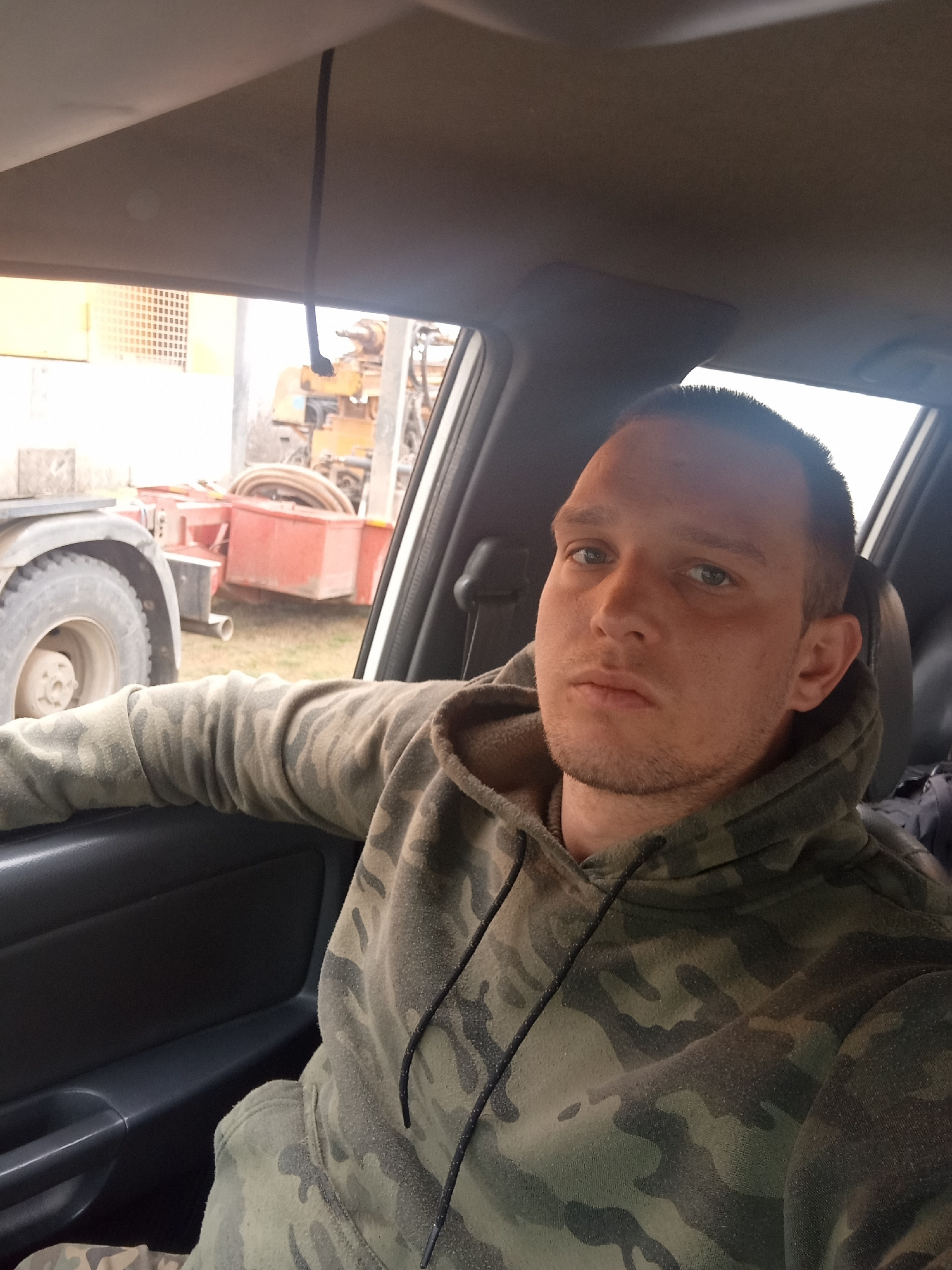 A man is sitting in a vehicle. The man has short hair, light eyes, and a slight beard. He is wearing a camouflage hoodie. The vehicle is near some heavy machinery, including a truck and a trailer with…read more