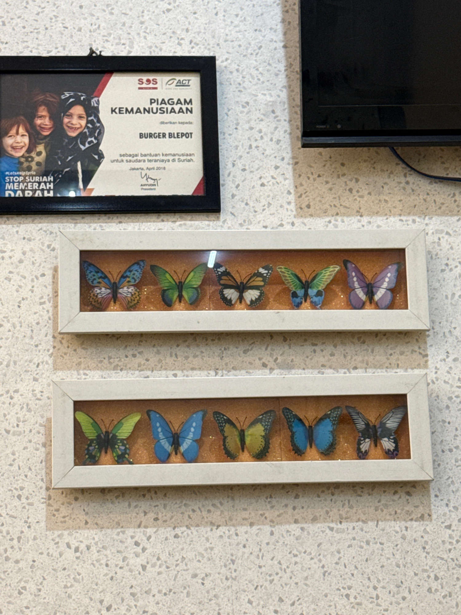 A close-up indoor shot shows a section of a speckled wall with a dark flat-screen television mounted on the left. To the right of the TV, a black-framed certificate with text in Indonesian, "PIAGAM KE…read more