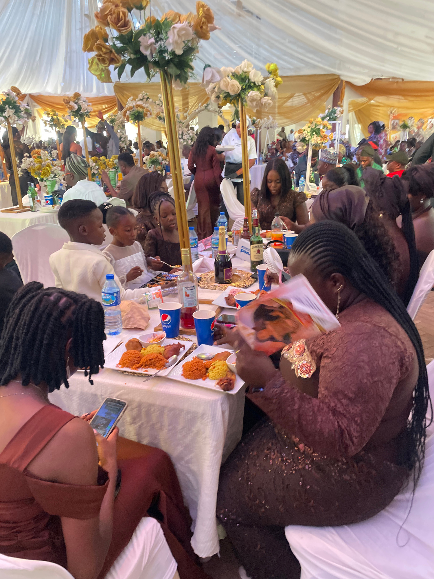 The image shows a gathering, possibly a wedding reception, taking place under a white tent structure. Tables are set with food and drinks. Individuals are seated around the tables, eating, talking, anβ¦read more