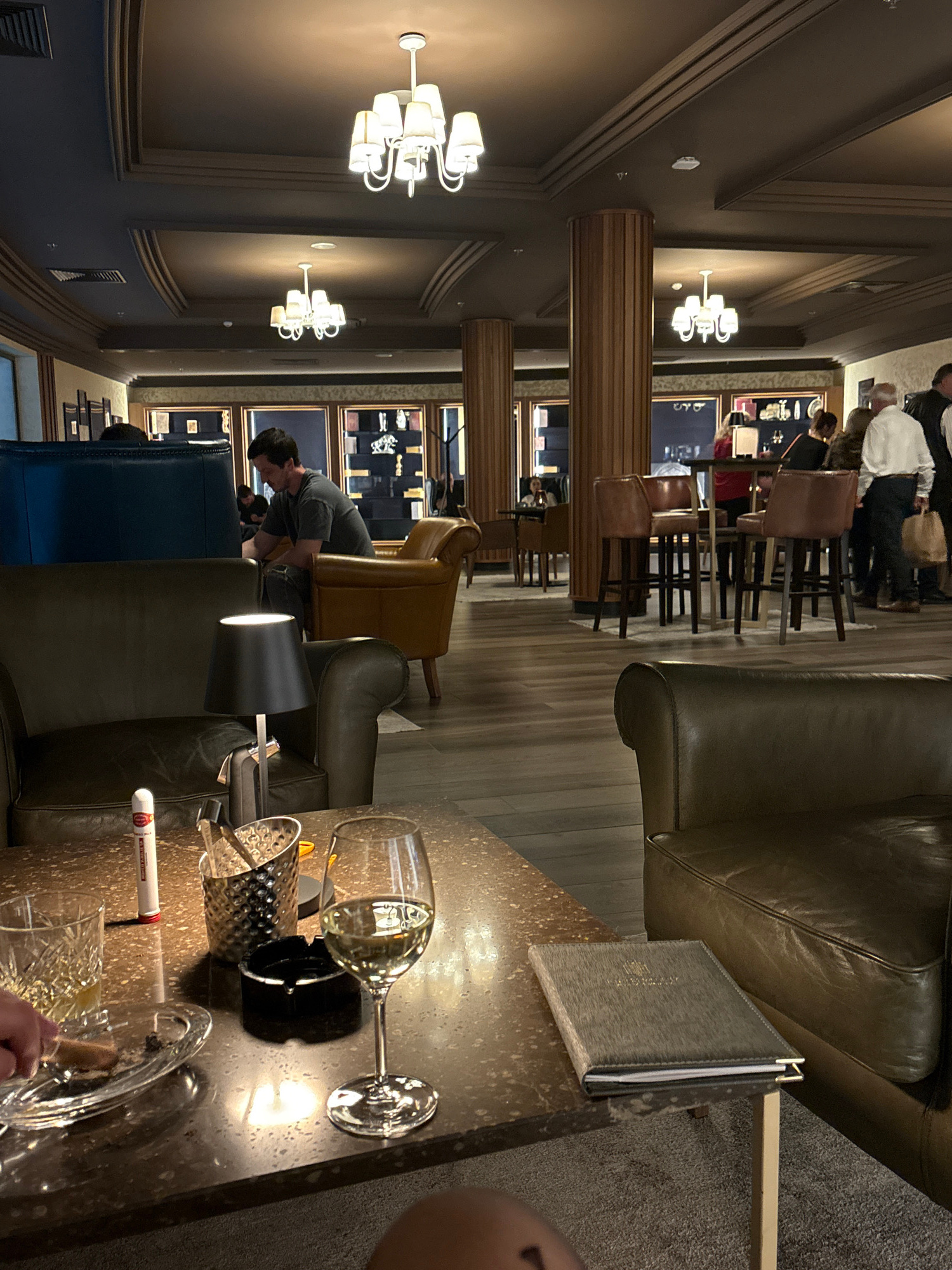 The image shows the interior of a lounge, possibly a cigar lounge. The scene includes leather seating, a bar area with high stools, and displays of items on the walls. There are people present in the…read more