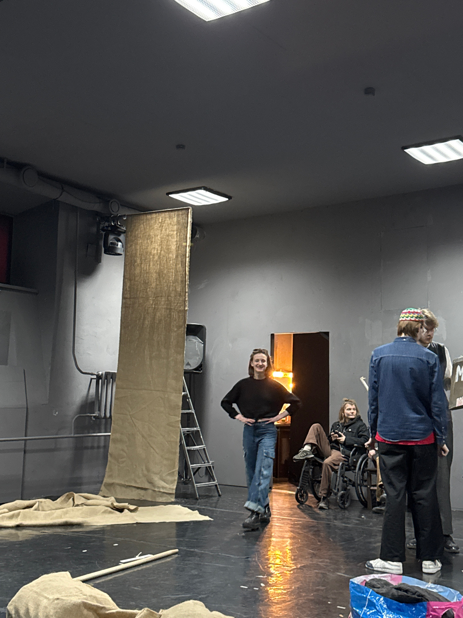 The image shows a scene likely on a stage or studio. Three people are visible: one man standing with his hand on his hip, wearing a black shirt and jeans; a person in a wheelchair wearing a black jack…read more