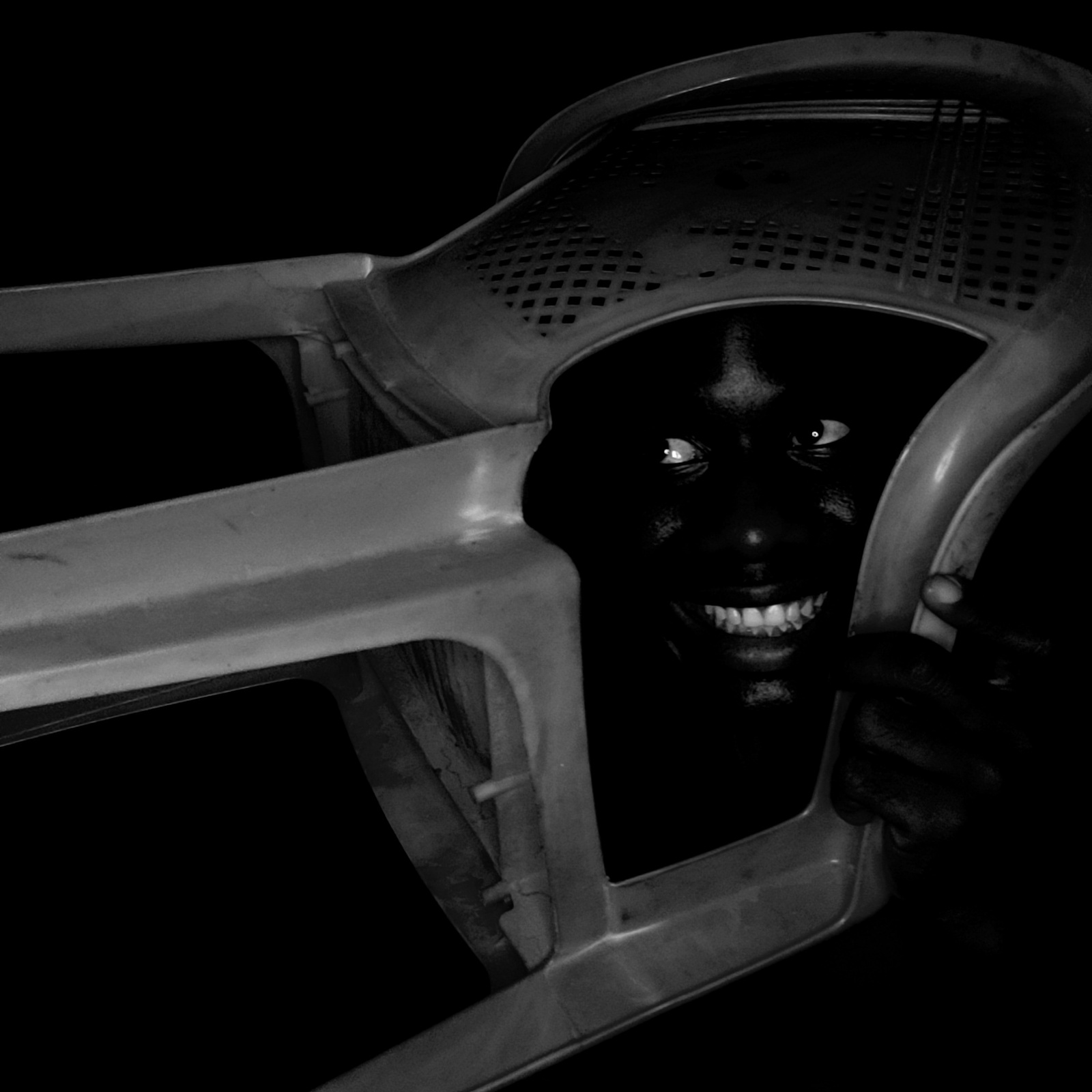 This black and white image presents a dramatic and high-contrast composition featuring a person's face peering from behind a plastic chair. The background is entirely black, accentuating the stark lig…read more