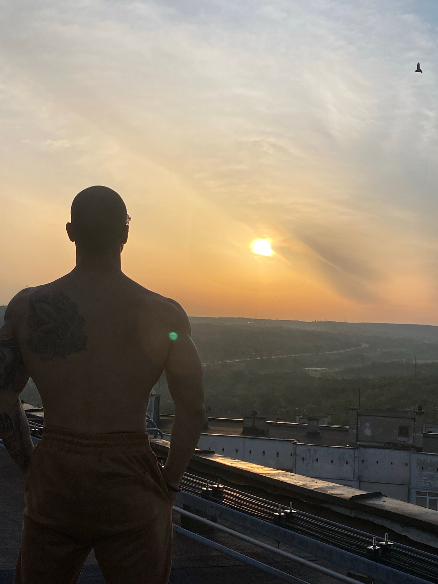 A photograph taken in Pleven, Bulgaria, showing a man with a shaved head wearing pants and no shirt standing on a rooftop at sunset. The man is in the foreground and is partially silhouetted against t…read more