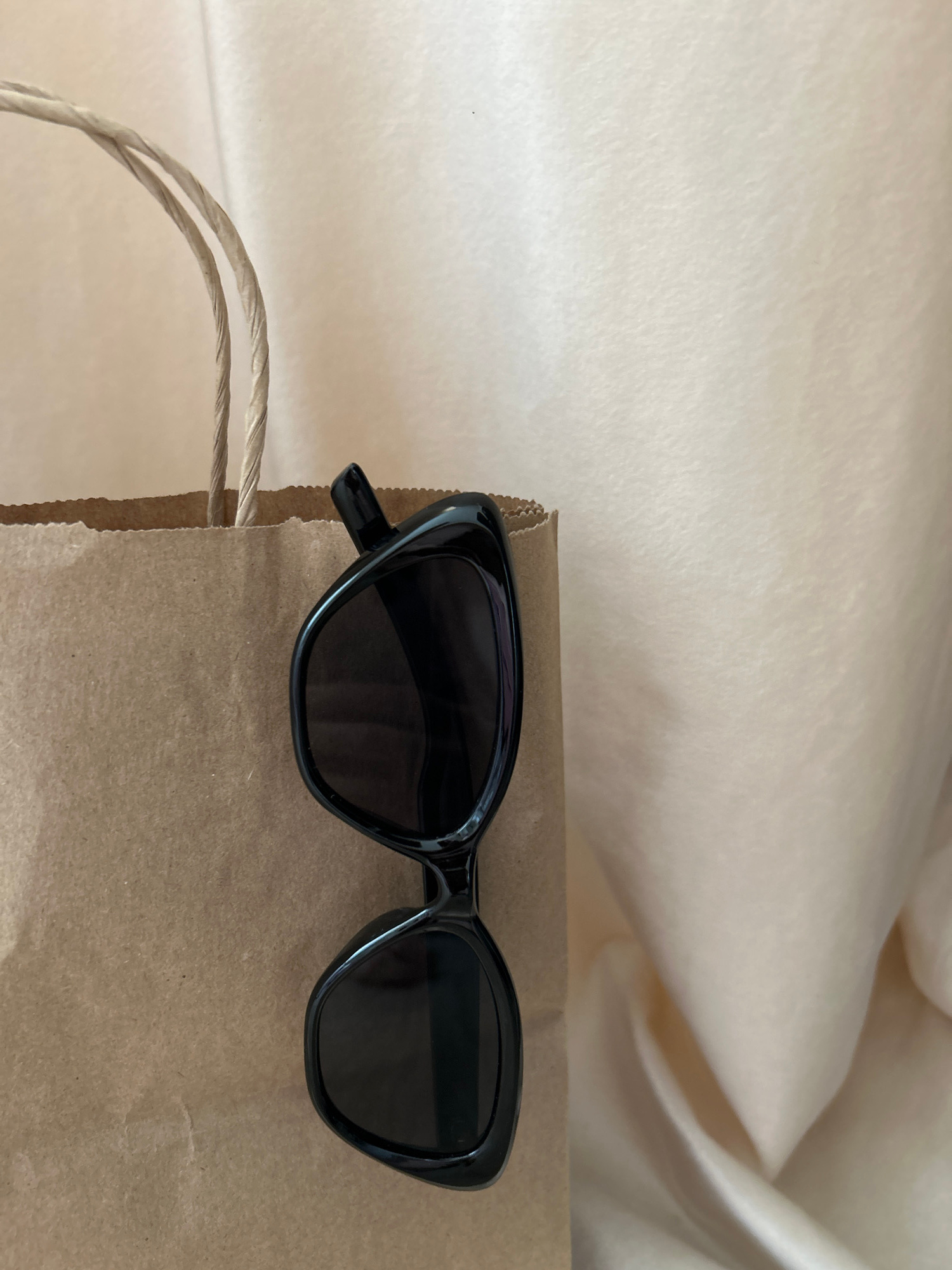 The image shows a pair of black sunglasses resting on a brown paper bag. The background is a draped, light-colored fabric. There is nothing in the image to indicate that it was taken in Ufa, Russia or…read more