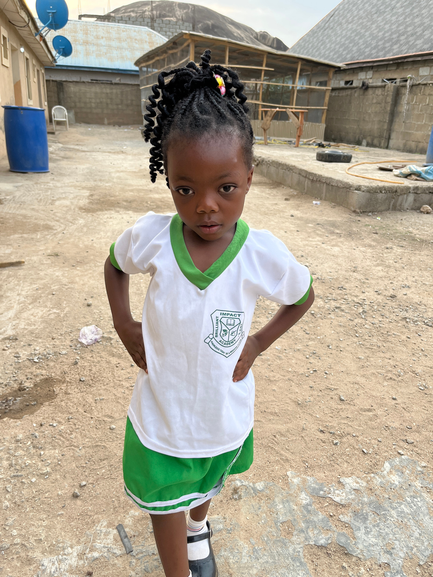 A young girl stands in an outdoor area in Madalla, Nigeria. She wears a white short-sleeved shirt with green trim and a green school uniform skirt. She has dark skin and dark braided hair adorned with…read more