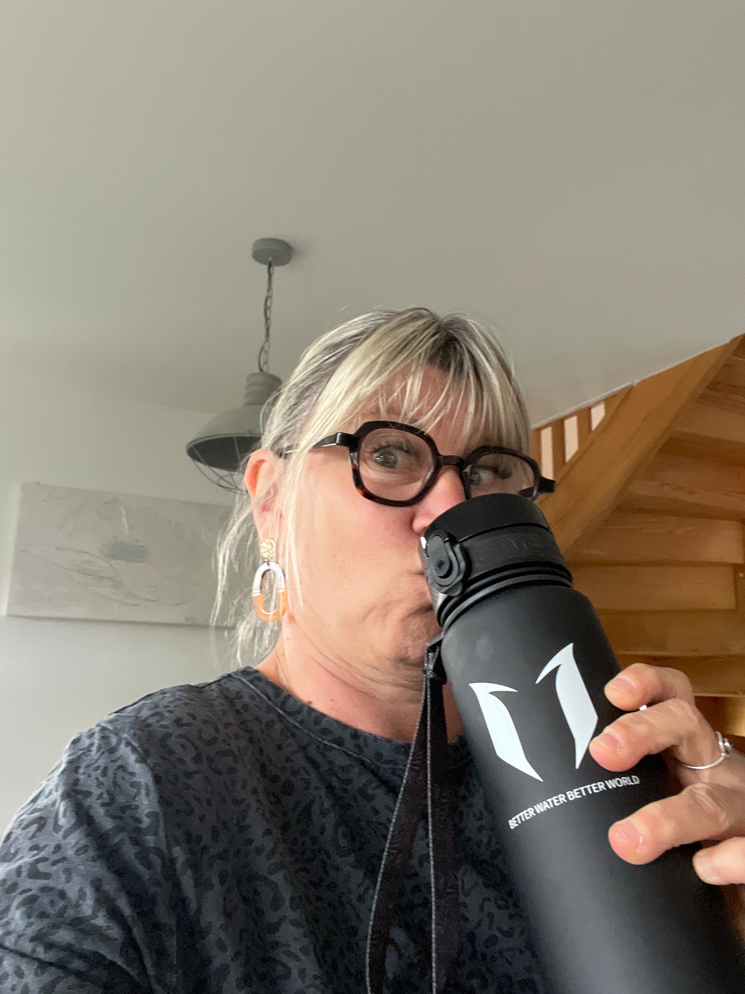 A middle-aged woman with short blonde hair and black-rimmed glasses is drinking from a black water bottle with a white logo and the words "BETTER WATER BETTER WORLD" printed on it. She is wearing a da…read more