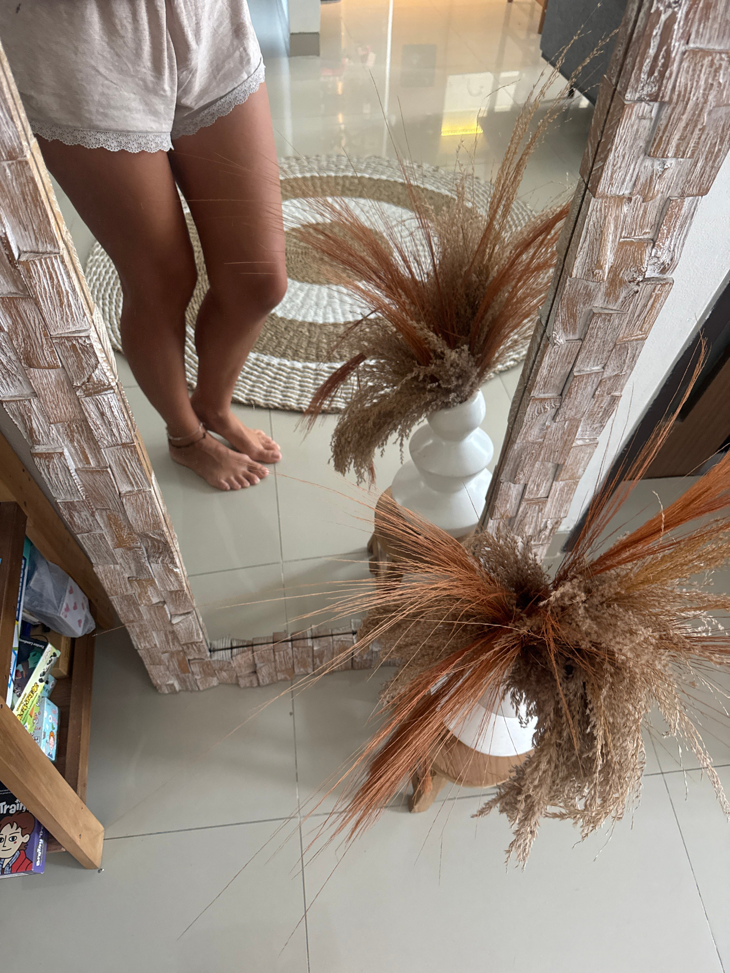 The image shows a reflection in a mirror with a textured, wooden frame. The reflection captures a person's legs and feet, clad in light-colored shorts with a lace trim. The legs are positioned against…read more