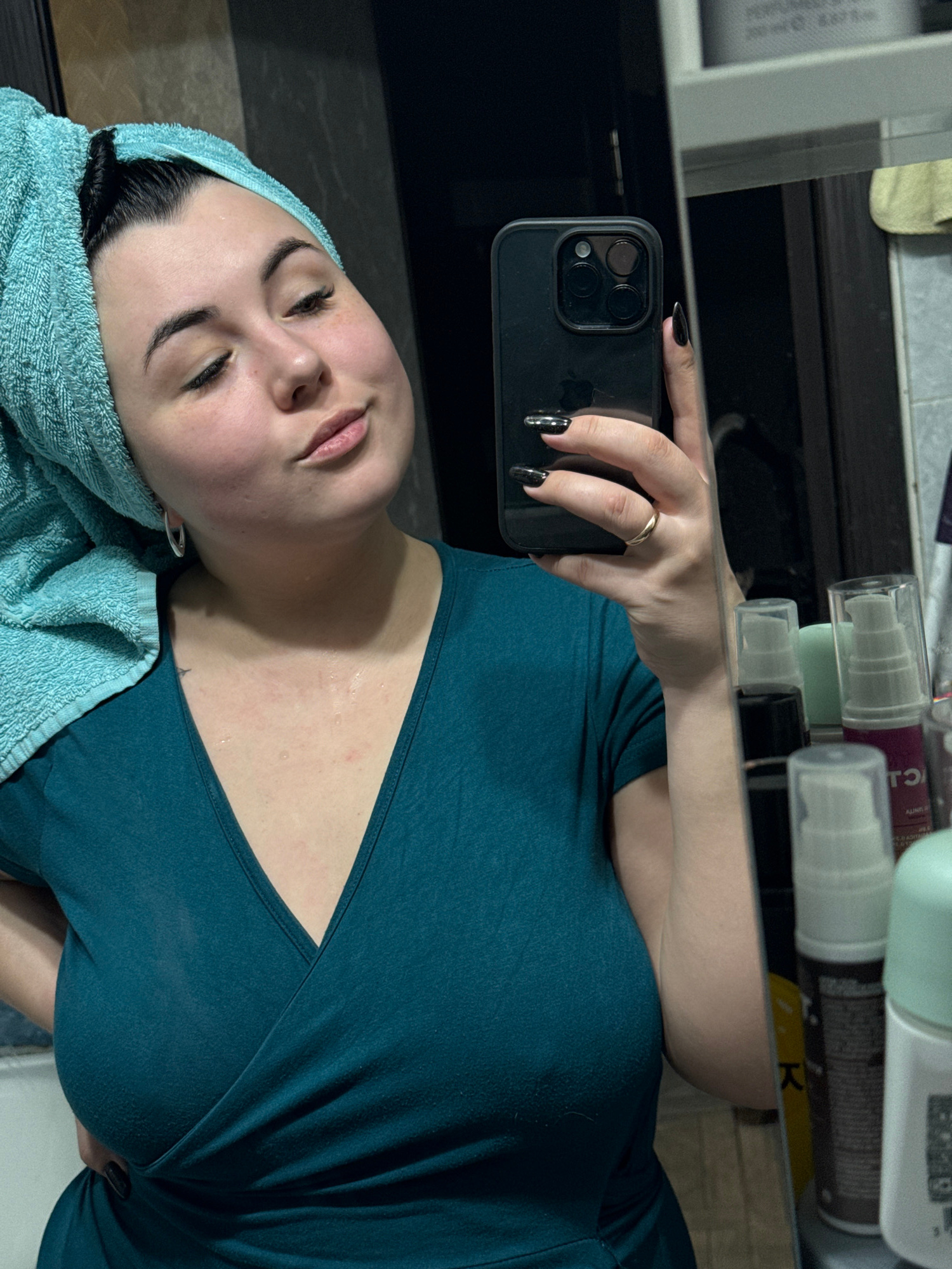 A woman is taking a selfie in what appears to be a bathroom. She is wearing a teal-colored top and has a light blue towel wrapped around her head. She is holding a black smartphone in her right hand,…read more