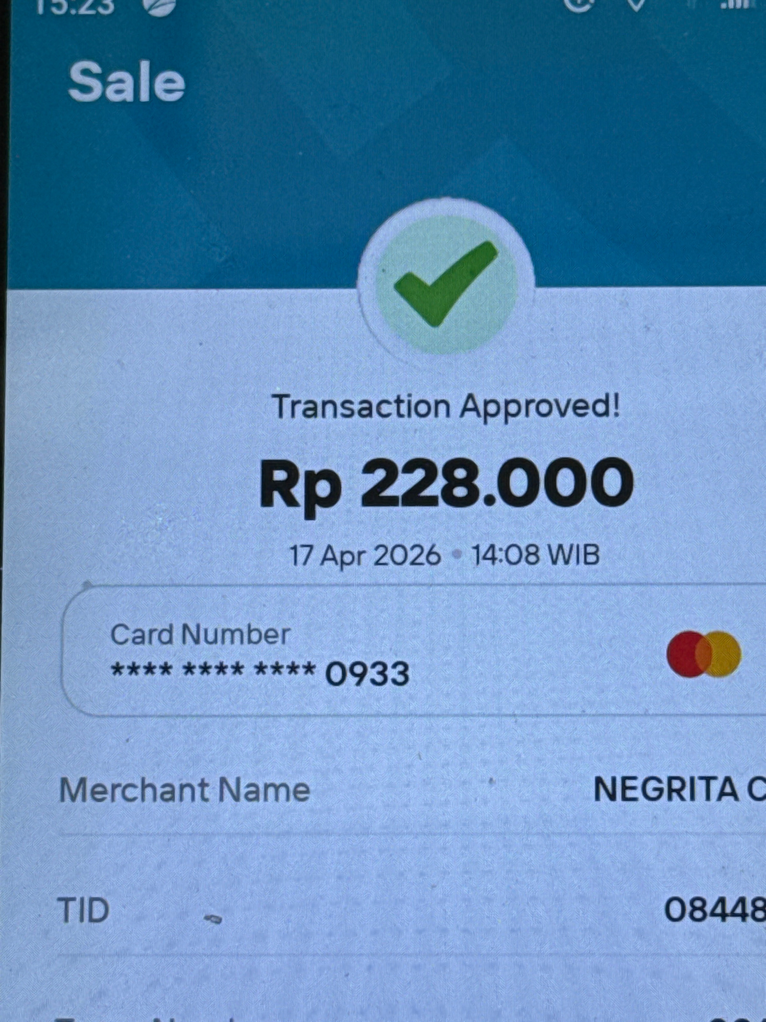 This close-up image captures a digital screen, likely a point-of-sale (POS) terminal or a smartphone, displaying a successful transaction in North Kuta, Indonesia. The screen shows a "Transaction Appr…read more