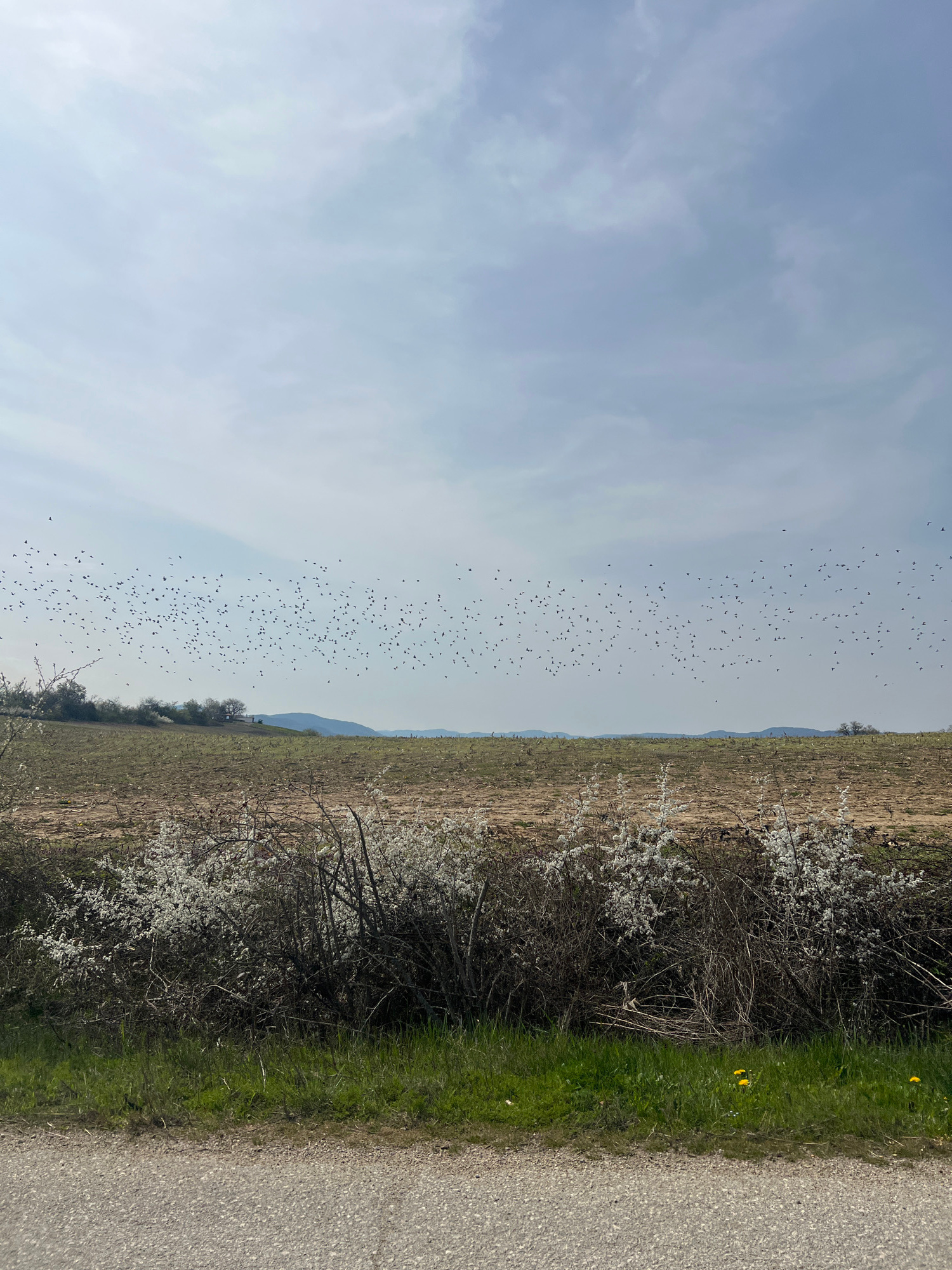 The image shows a landscape with a large flock of birds flying in the sky above a field. The field appears to be dry or recently cultivated. In the foreground, there is vegetation including shrubs wit…read more