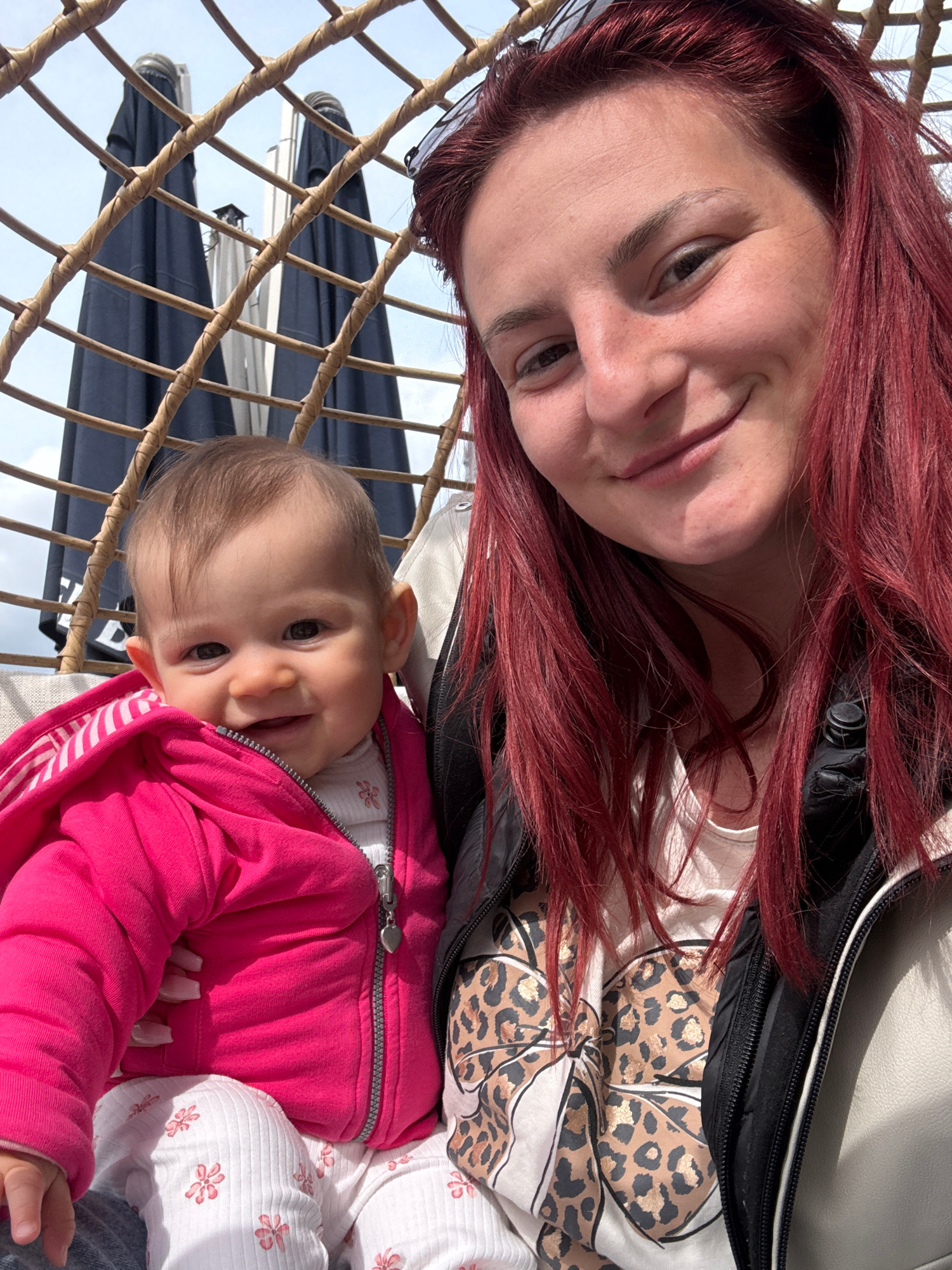 A selfie-style photograph shows a woman and a baby. The woman, who has red hair, is at the top of the frame, smiling. She is wearing a white shirt with a leopard print design and a black jacket. The b…read more