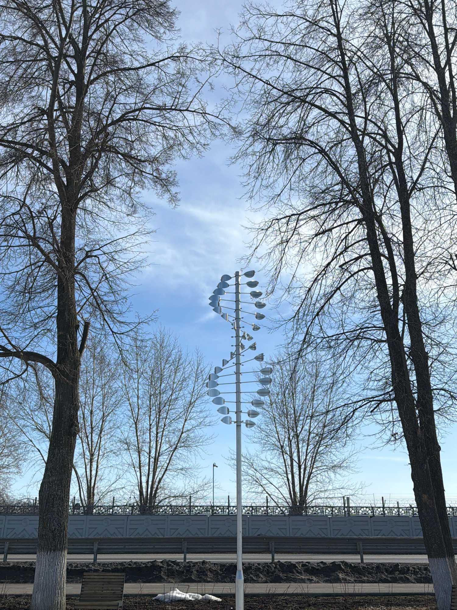 The image presents a view of a park or green space in Votkinsk, Russia, framed by bare tree branches silhouetted against a blue sky with wispy clouds. At the center of the image, there's a modern wind…read more