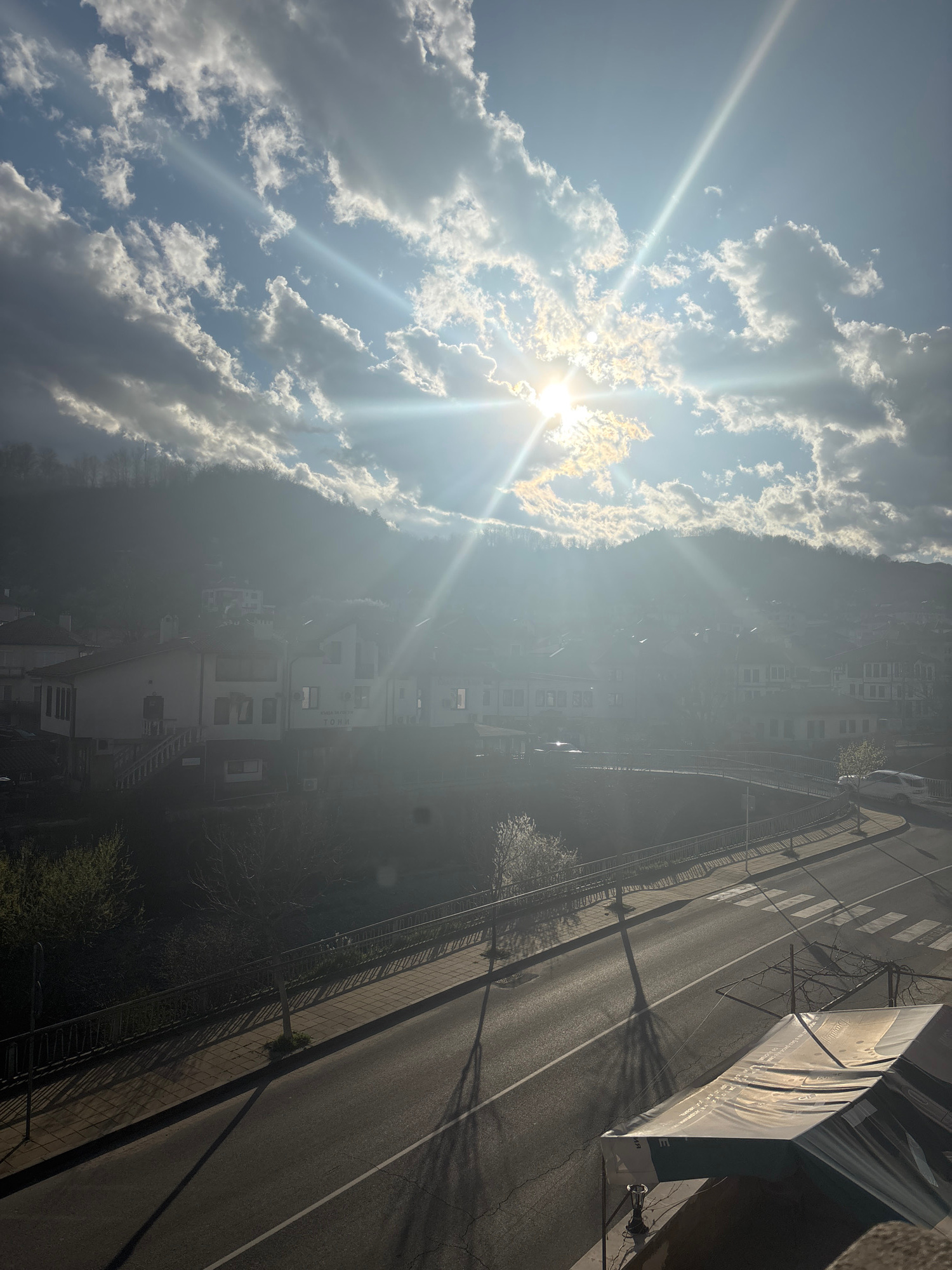 The image shows a street scene in Zlatograd, Bulgaria, viewed from an elevated position. The sun shines brightly through scattered clouds. A road runs along the right side, with streetlights and fenci…read more