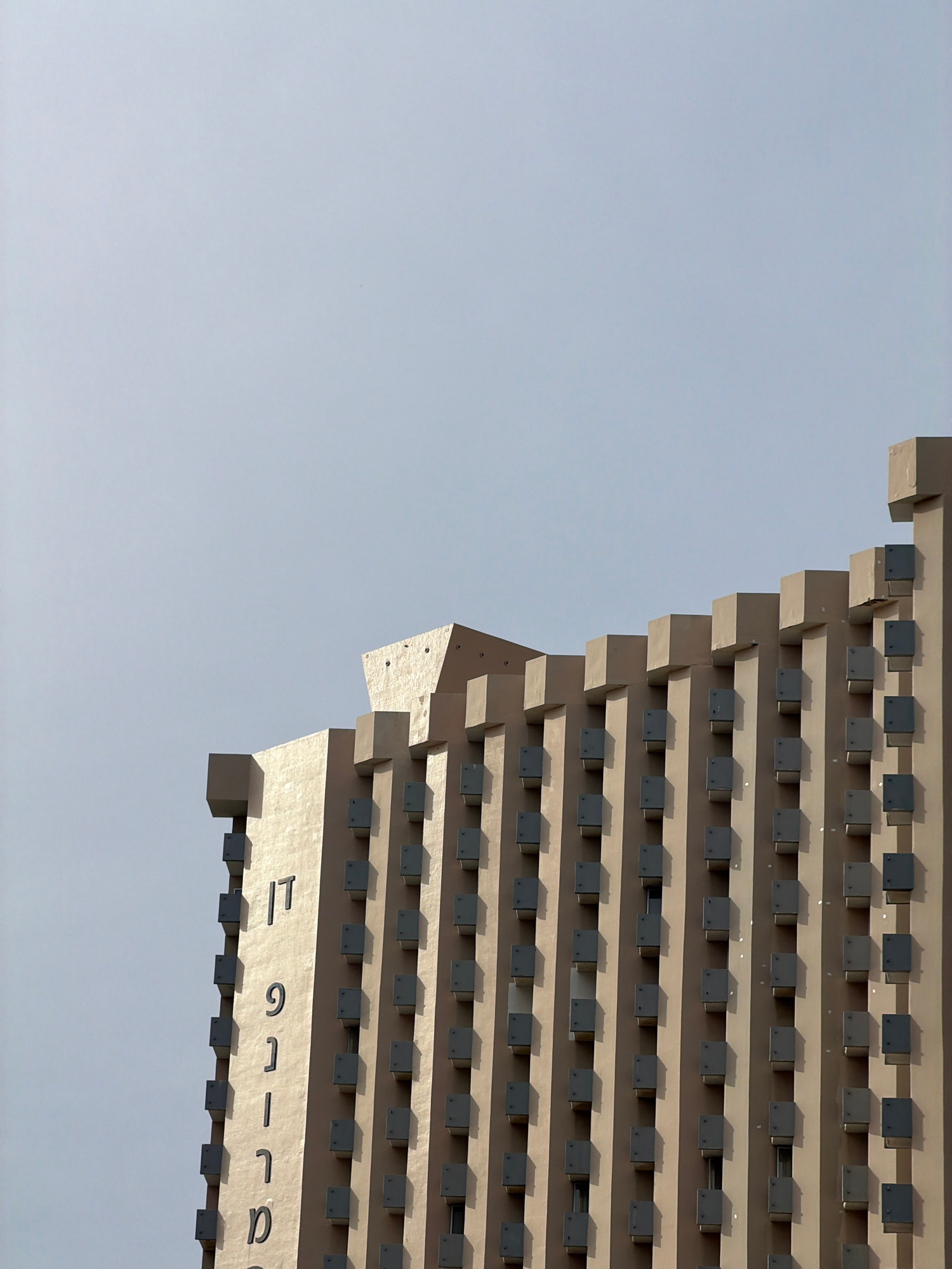 The image displays the upper section of the Dan Panorama Hotel in Tel Aviv, Israel, viewed from an upward angle against a clear, light blue-grey sky. The building's facade is constructed of light beig…read more