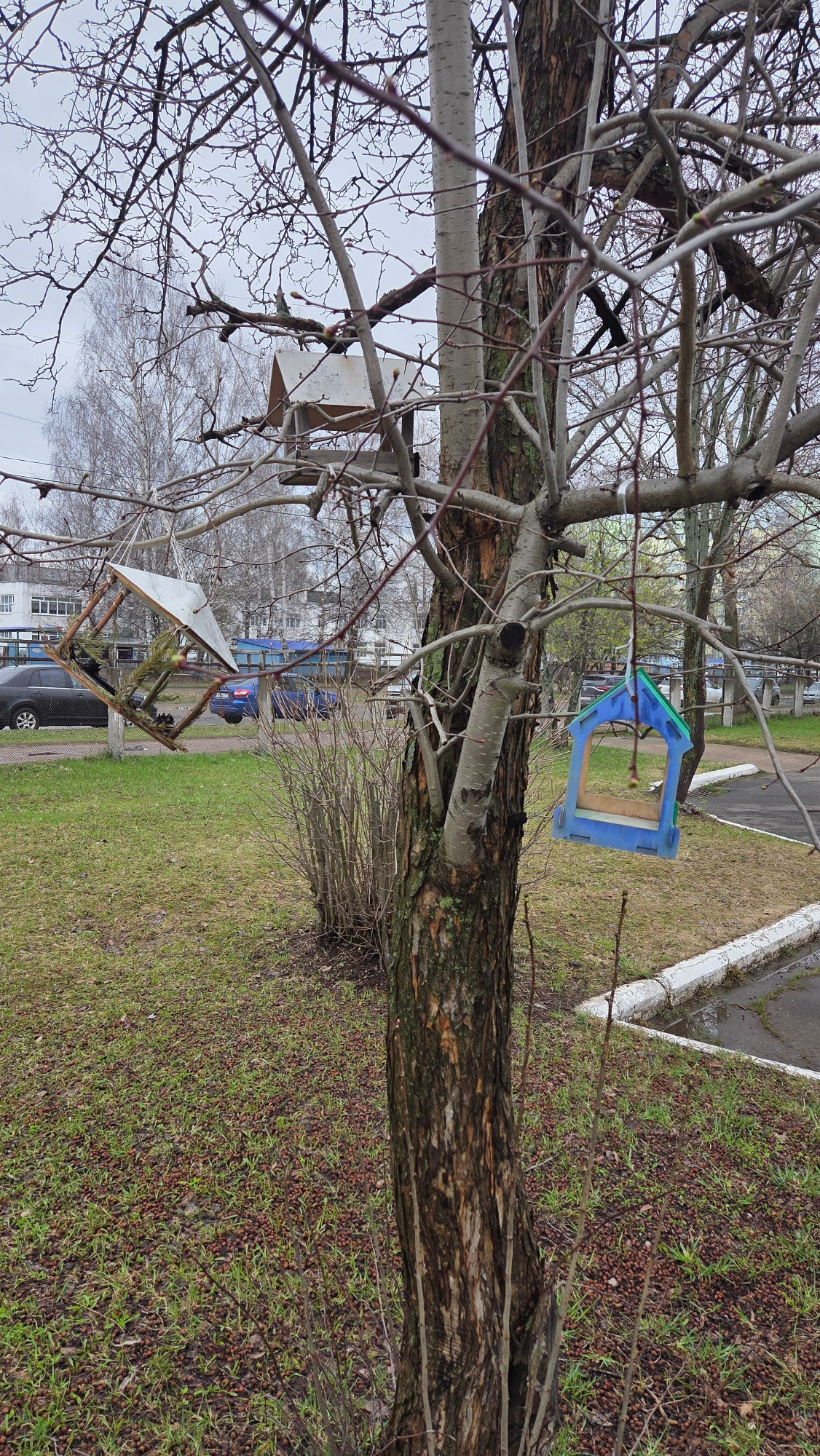 This outdoor scene, set in Chaikovsky, Russia, depicts a street with trees, grass, and bird feeders, likely during late winter or early spring given the bare branches. The sky is overcast, indicating…read more