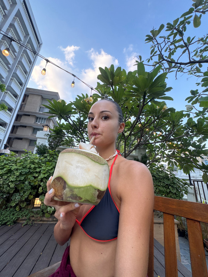 A young adult female is depicted in a medium-shot photograph on an outdoor terrace in Bangkok, Thailand. She has light skin, dark hair pulled back, and is wearing a black bikini top with red trim and…read more