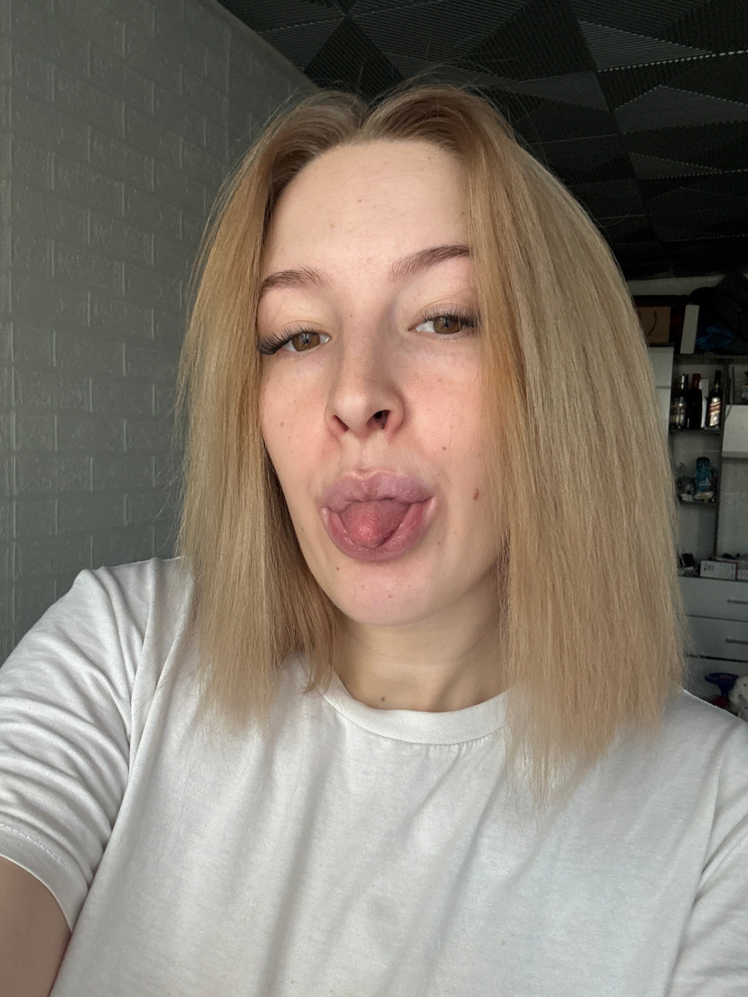 A close-up, rotated portrait shows a young woman with straight, shoulder-length blonde hair. She has fair skin with freckles and brown eyes that are looking towards the camera. She is wearing a plain…read more