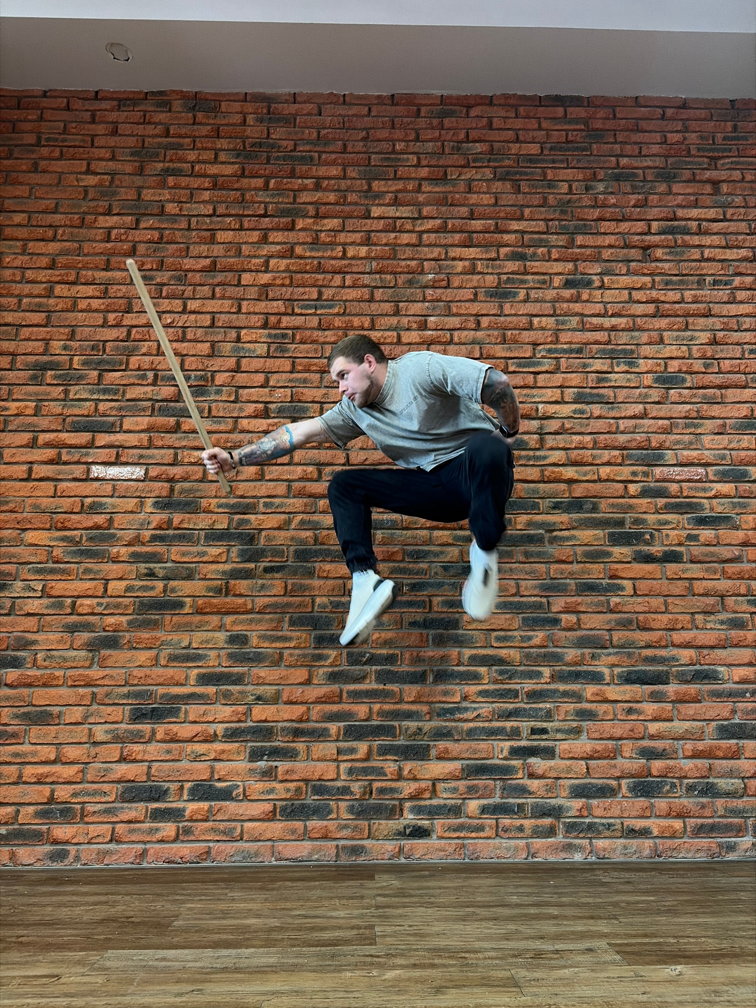 The image displays a man in an dynamic, acrobatic-like pose, appearing to balance on a vertical brick wall. The photograph is rotated 90 degrees clockwise, creating the illusion of the man defying gra…read more