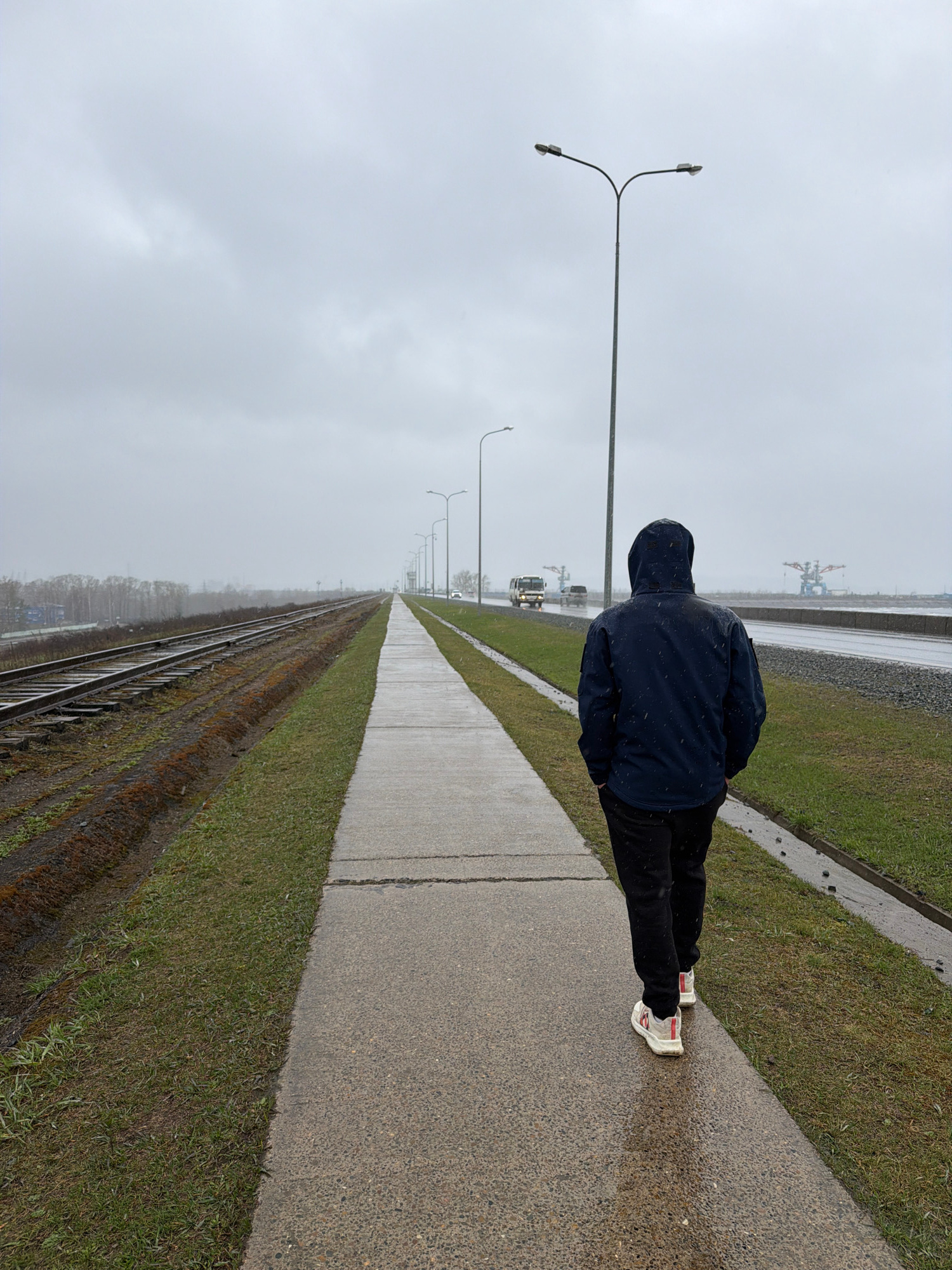 The image captures a person from behind, walking or standing on a paved path under a dull, overcast sky. The individual wears a dark blue hooded jacket, dark pants, and white sneakers with red accentsβ¦read more