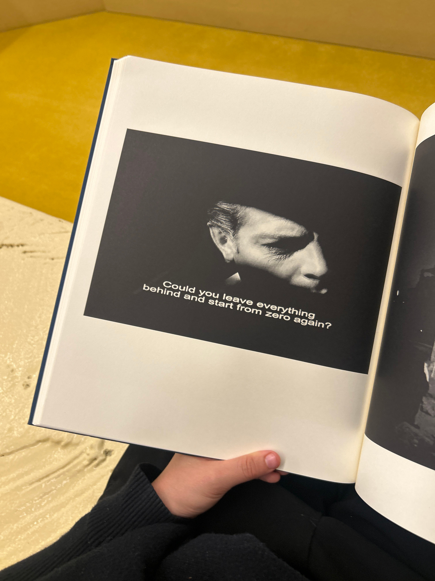 A slightly high-angle shot captures a spread within a book, held open by a hand. The book lies against a backdrop of textured, pale yellow upholstery, possibly a couch or chair. On the left page of th…read more