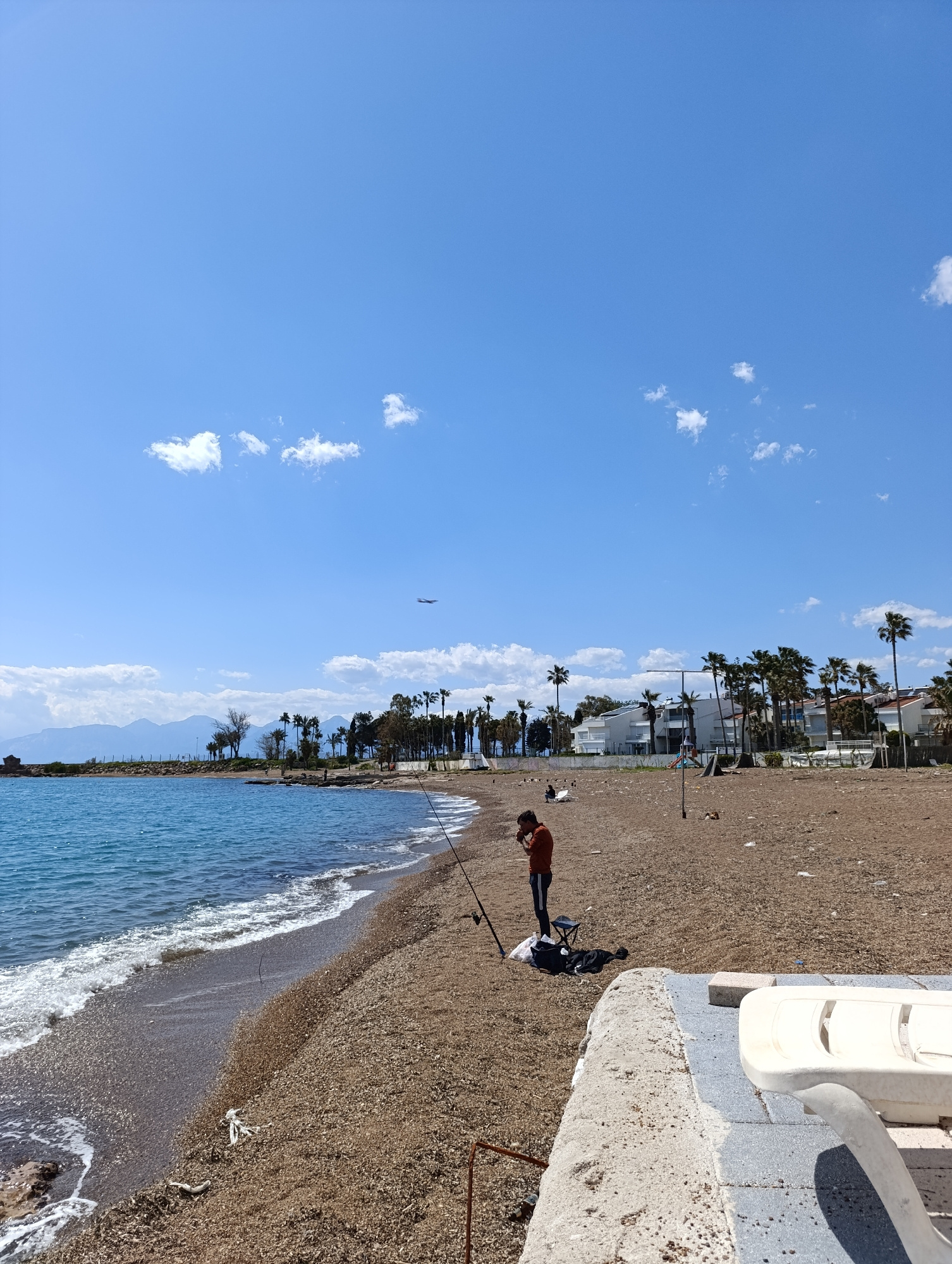 The image depicts a beach scene in Antalya, Turkey. The sky is blue with scattered clouds. The beach is composed of sand and pebbles, with seaweed and other debris. The water is turquoise with white-c…read more