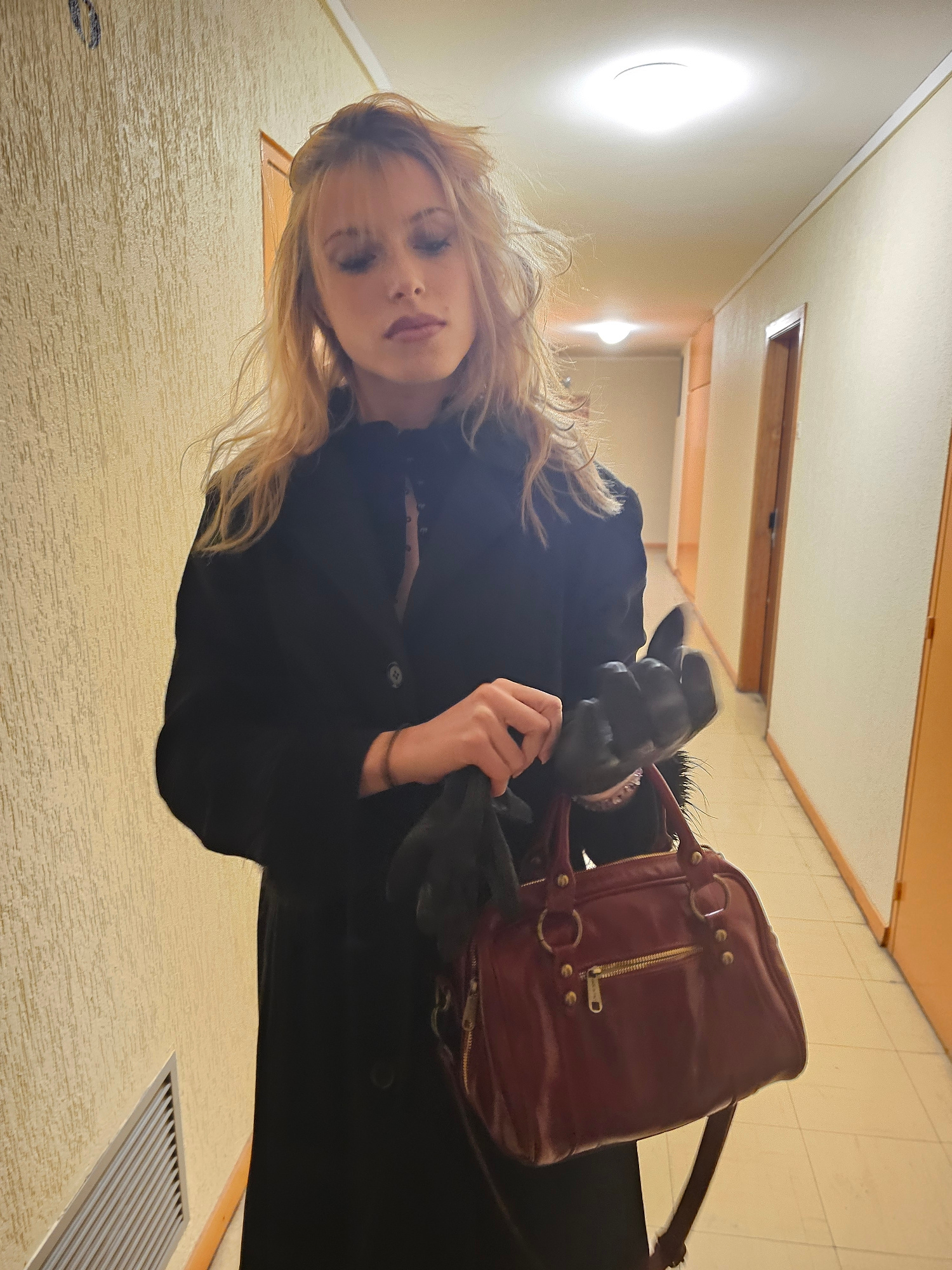 A female individual stands centrally in an indoor corridor in Pantin, France. She possesses long, wavy blonde hair and a fair complexion, with her eyes directed downwards. She wears a dark, possibly b…read more