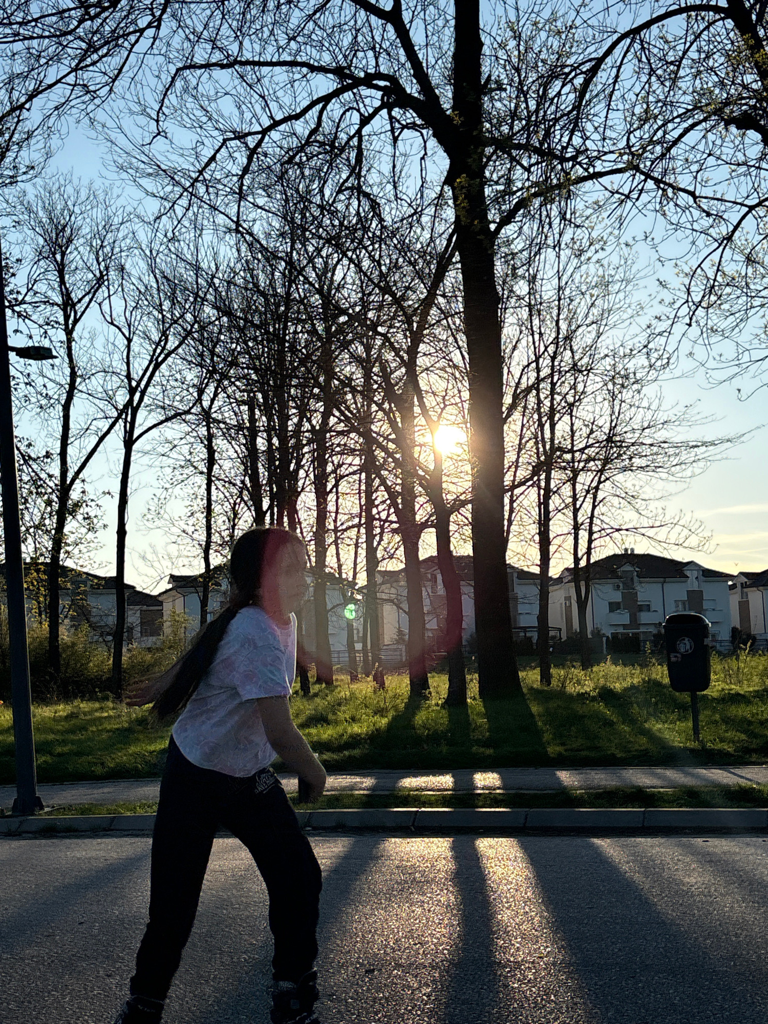 A person is walking on a sidewalk, the sky is behind them, and the sun shines through the trees. The person is wearing dark pants and a white shirt with a design. A few buildings are visible in the ba…read more