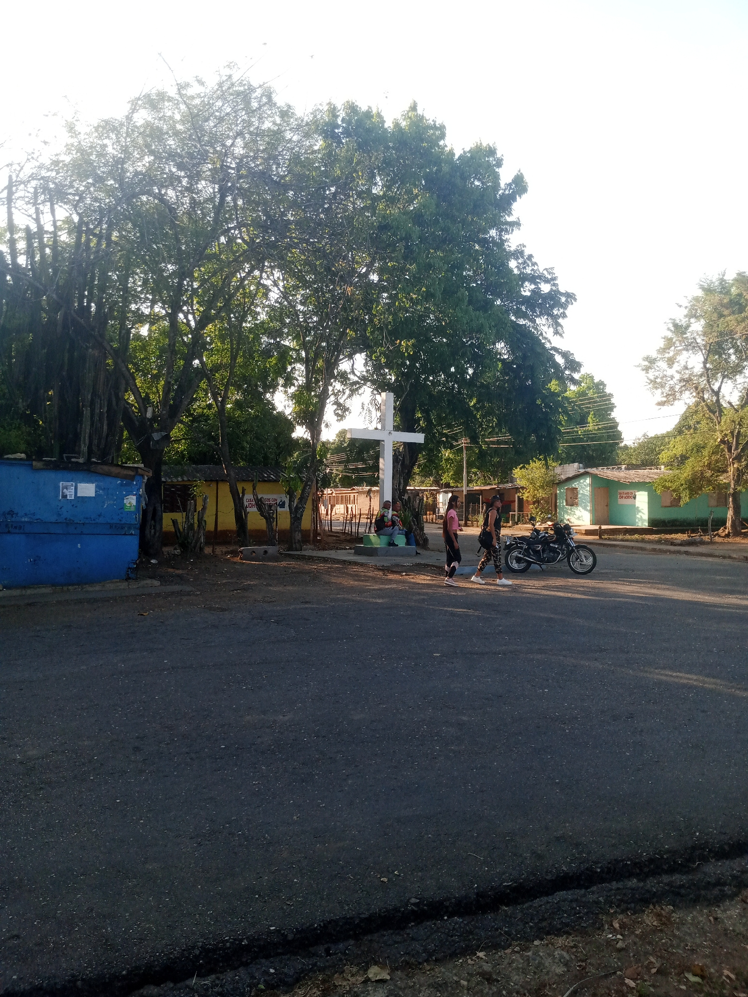 The scene depicts an urban street in Caño de Indio, Venezuela, dominated by an asphalt road surface in the foreground. To the left, a blue structure stands next to a yellow building. Lush green trees…read more