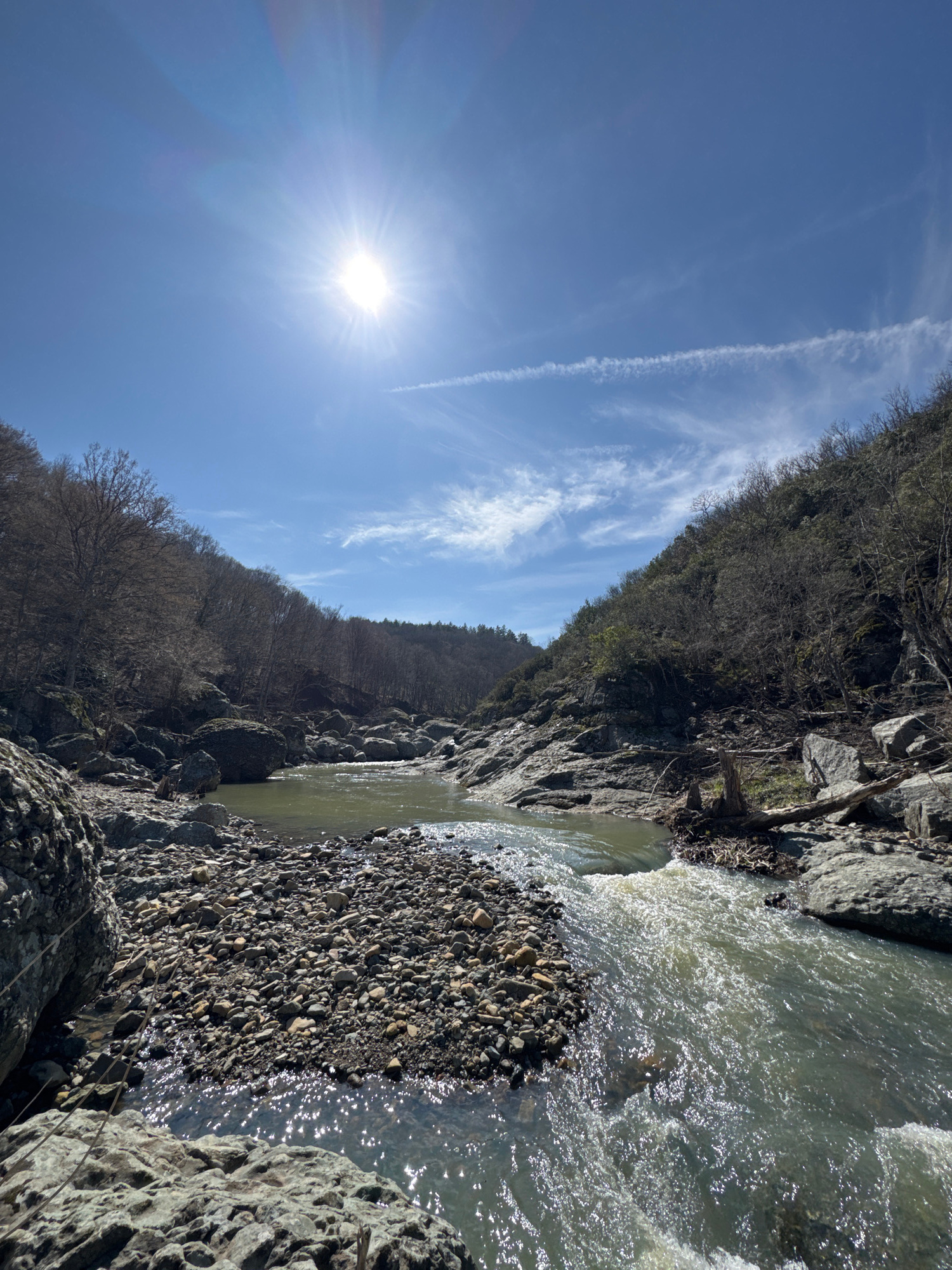 The image depicts a natural riverine landscape within a valley in Fazanovo, Bulgaria, under clear, bright daylight. The sun, positioned in the upper left quadrant, radiates intensely, creating lens fl…read more
