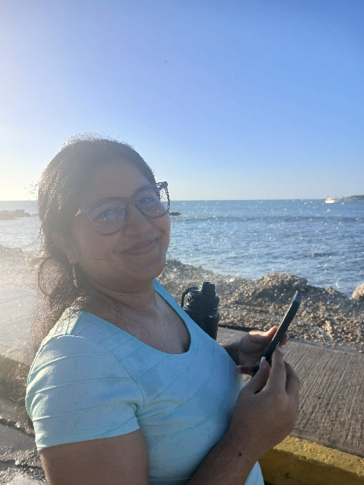 A woman with glasses holds a phone near a body of water. She wears a light blue shirt and sits on a concrete surface. The water glistens in the sunlight. A black object rests near her. The sky is clea…read more
