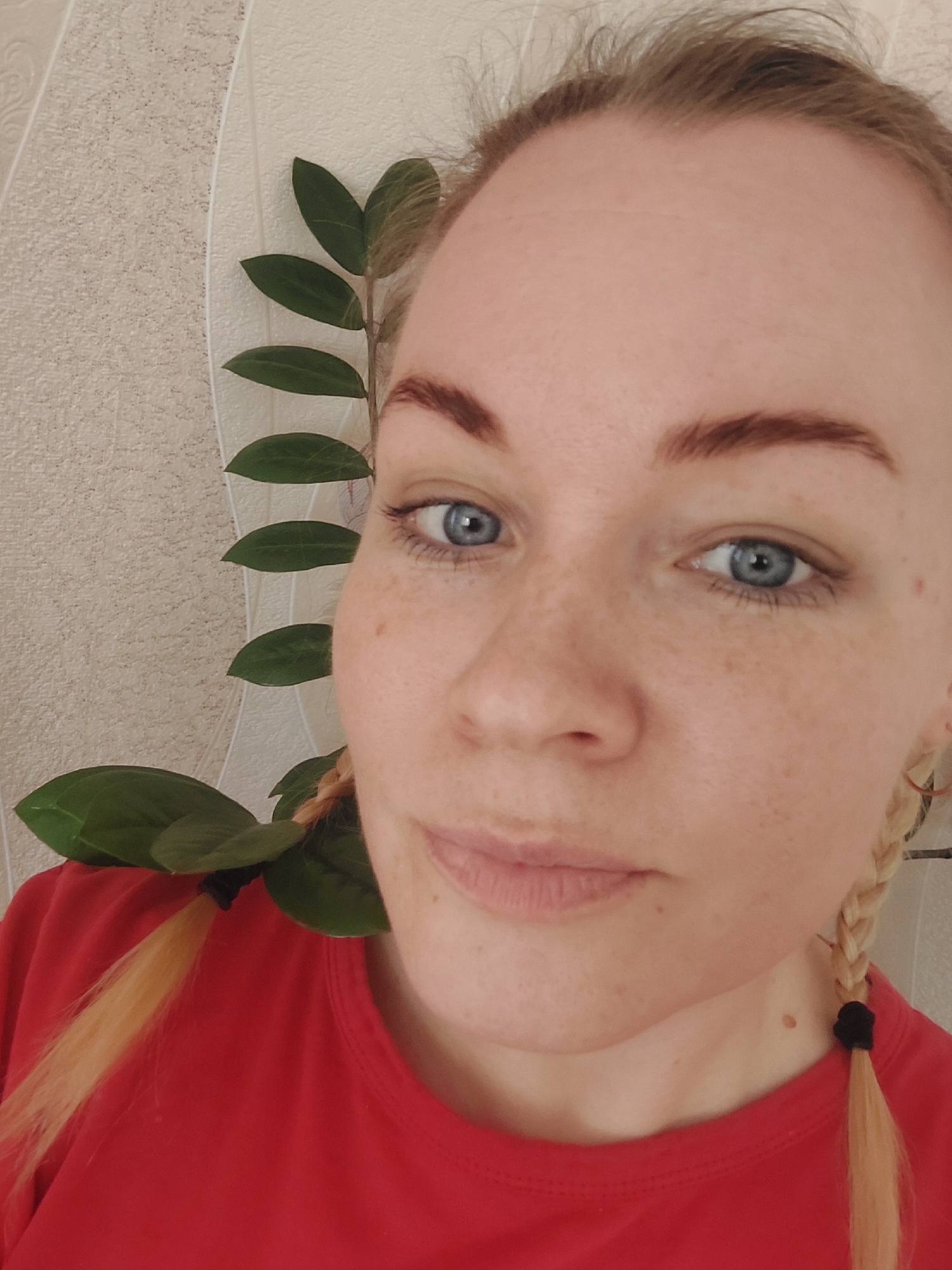 A photograph, rotated clockwise approximately 90 degrees, shows a woman's face and part of her upper body in an indoor setting. She has fair skin, freckles, and light blue eyes. Her eyebrows are reddi…read more