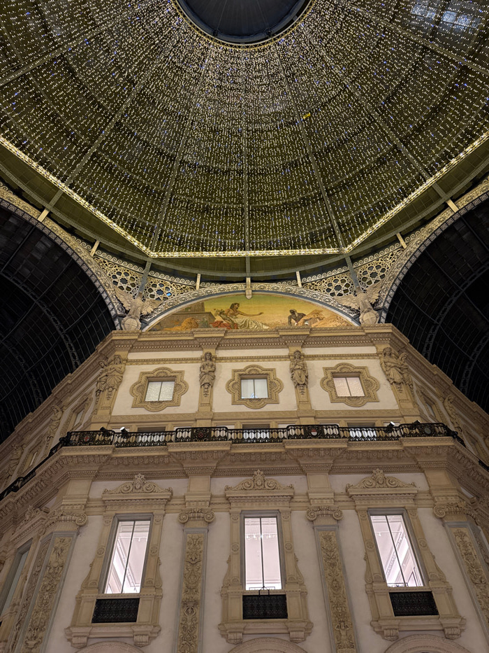 The image displays an upward view within the Galleria Vittorio Emanuele II in Milan, Italy, during nighttime. The upper section is dominated by the expansive, ornate glass and iron dome, which is heav…read more