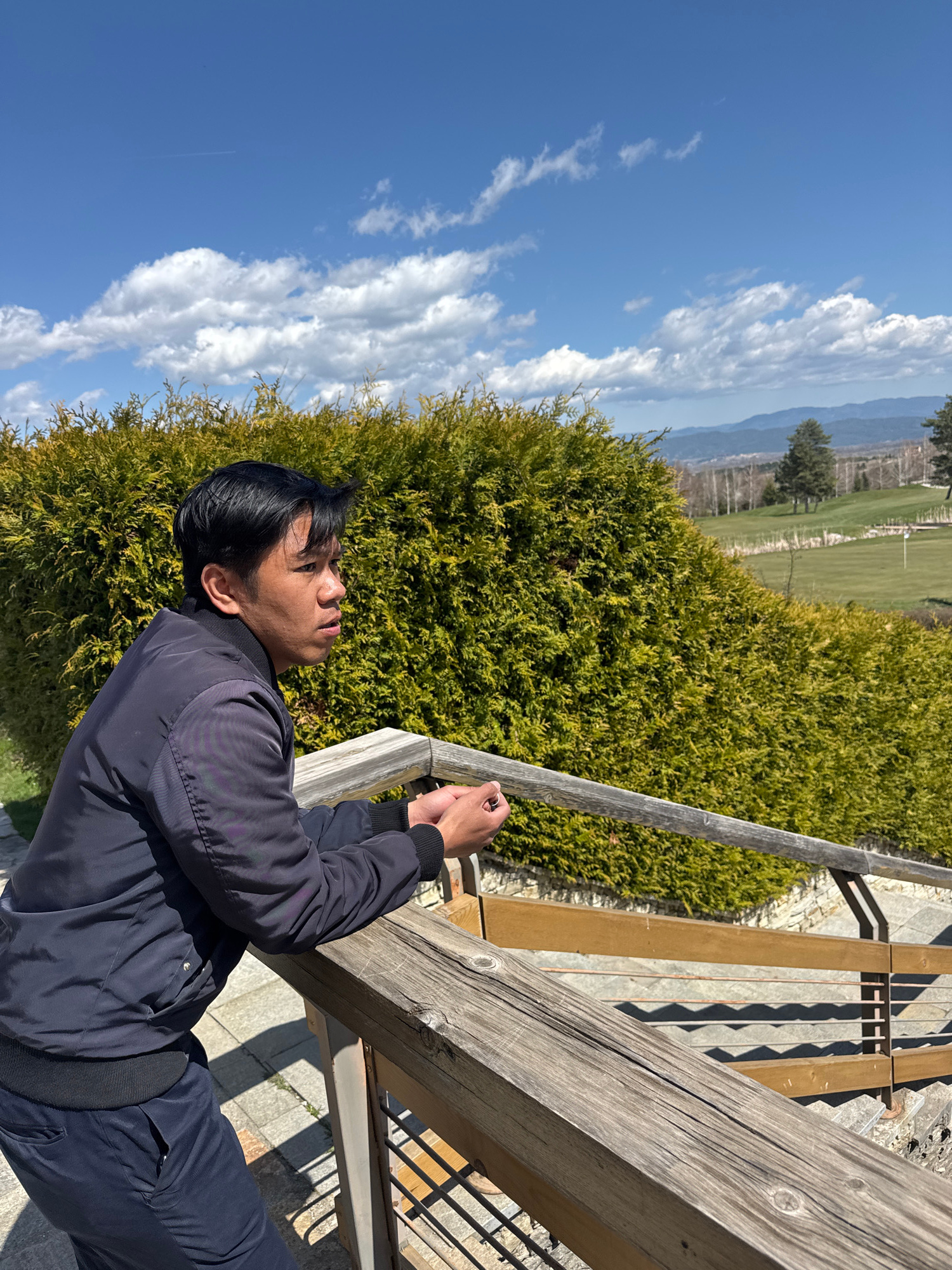 A medium shot depicts a person of Asian descent standing on what appears to be a wooden viewing platform. The person is wearing a navy blue jacket and matching pants with a black belt. They are holdin…read more