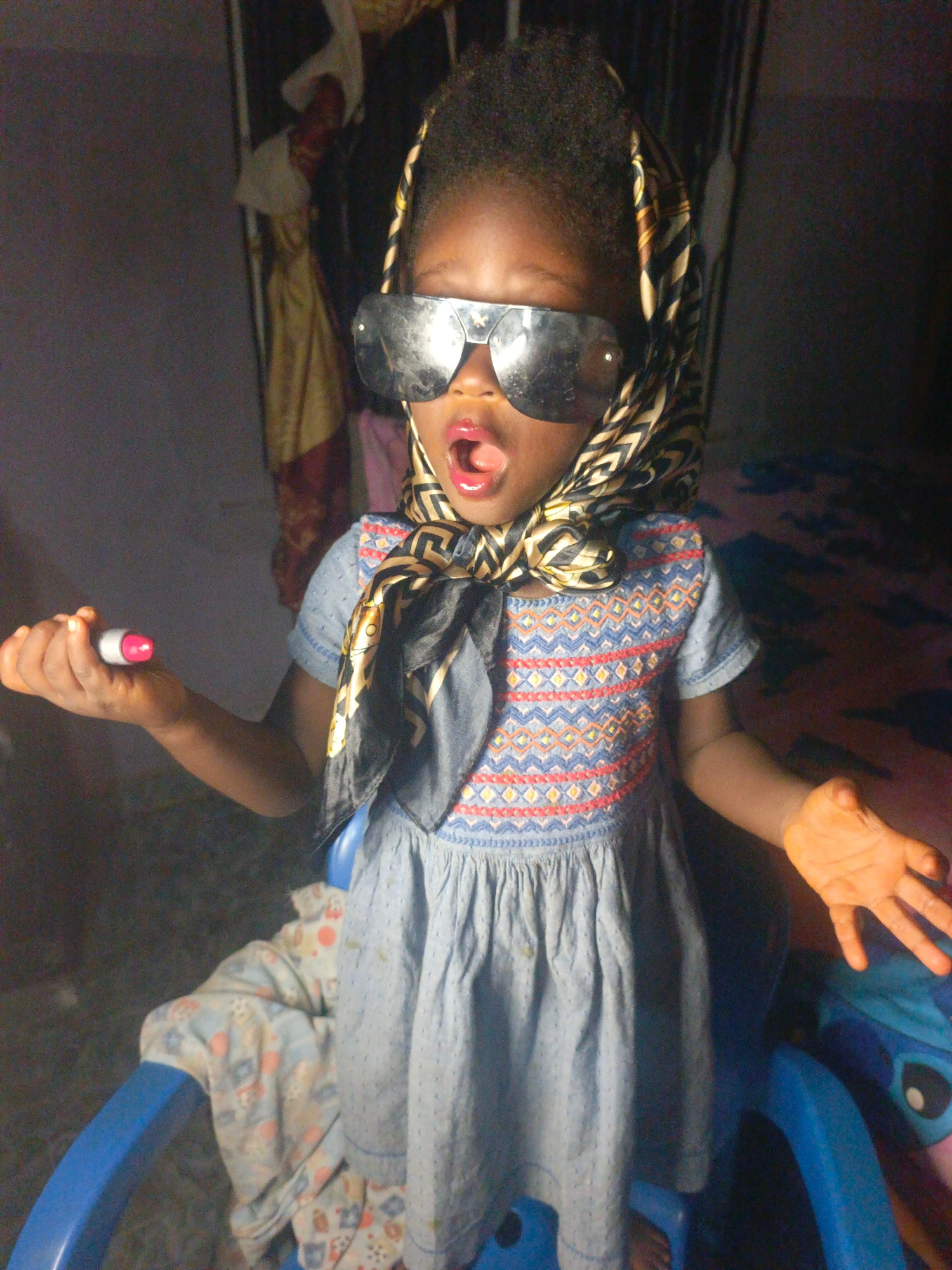 A child, likely a toddler, is seated in a blue plastic chair in Akwanga, Nigeria. The child is wearing sunglasses, a patterned headscarf, and a blue dress with embroidered details on the bodice. The c…read more