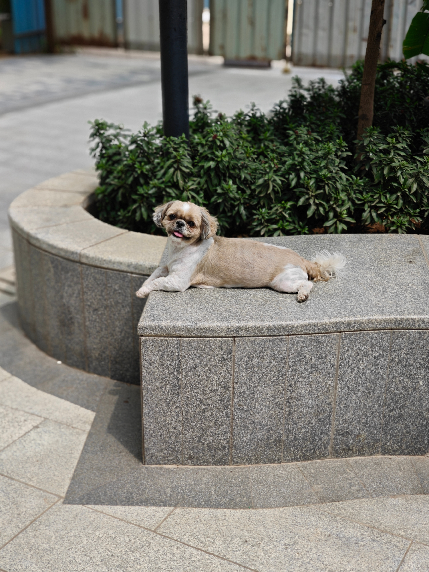 A tan and white Shih Tzu dog lies on a grey granite bench, with its tongue slightly protruding. The bench forms the edge of a raised planter filled with lush green shrubbery. Behind the planter, a blaβ¦read more