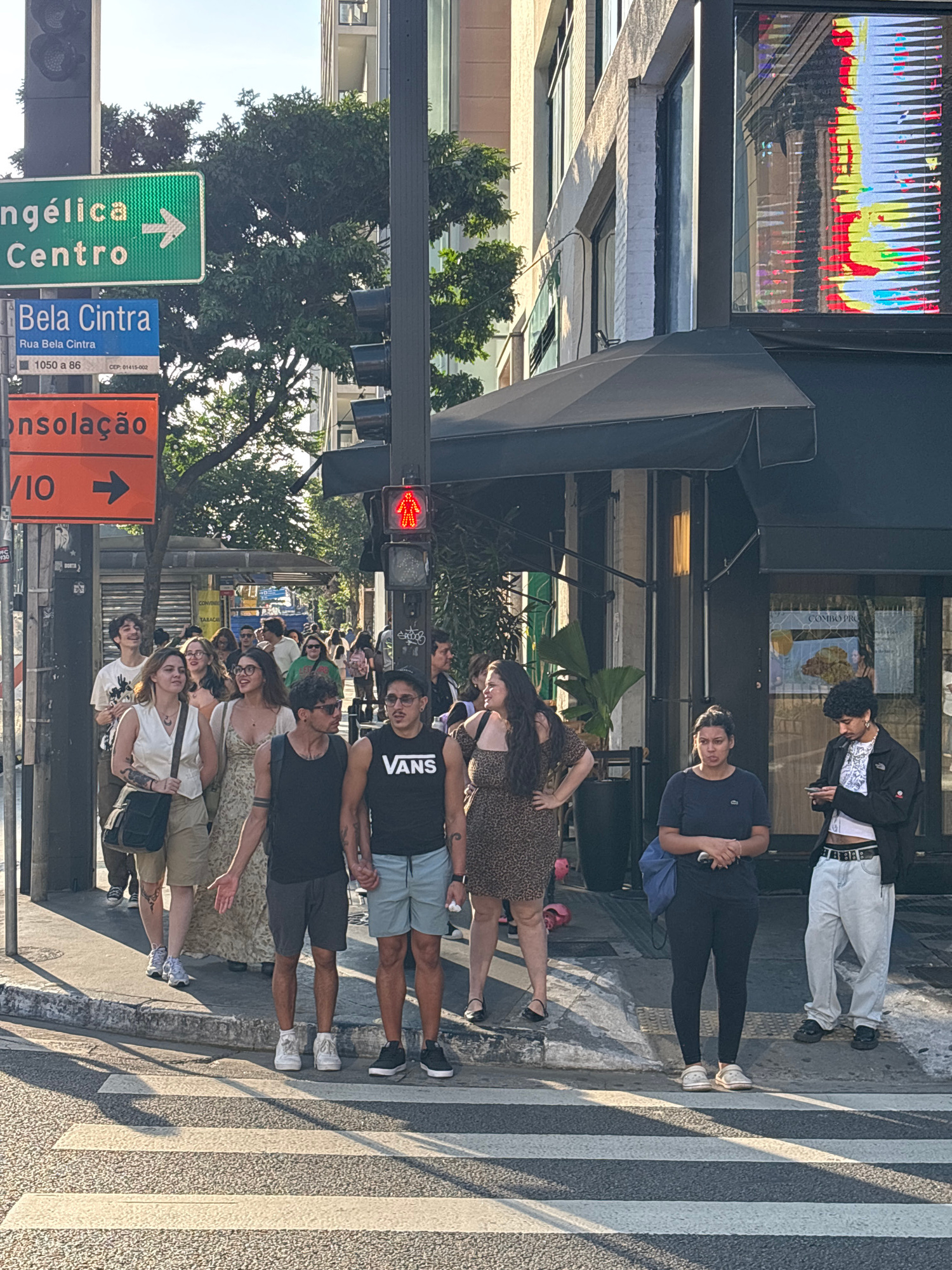 The image captures a group of people standing on a zebra crossing at a street intersection in São Paulo, Brazil. The location is suggested by street signs indicating "Angélica Centro" and "Consolação…read more