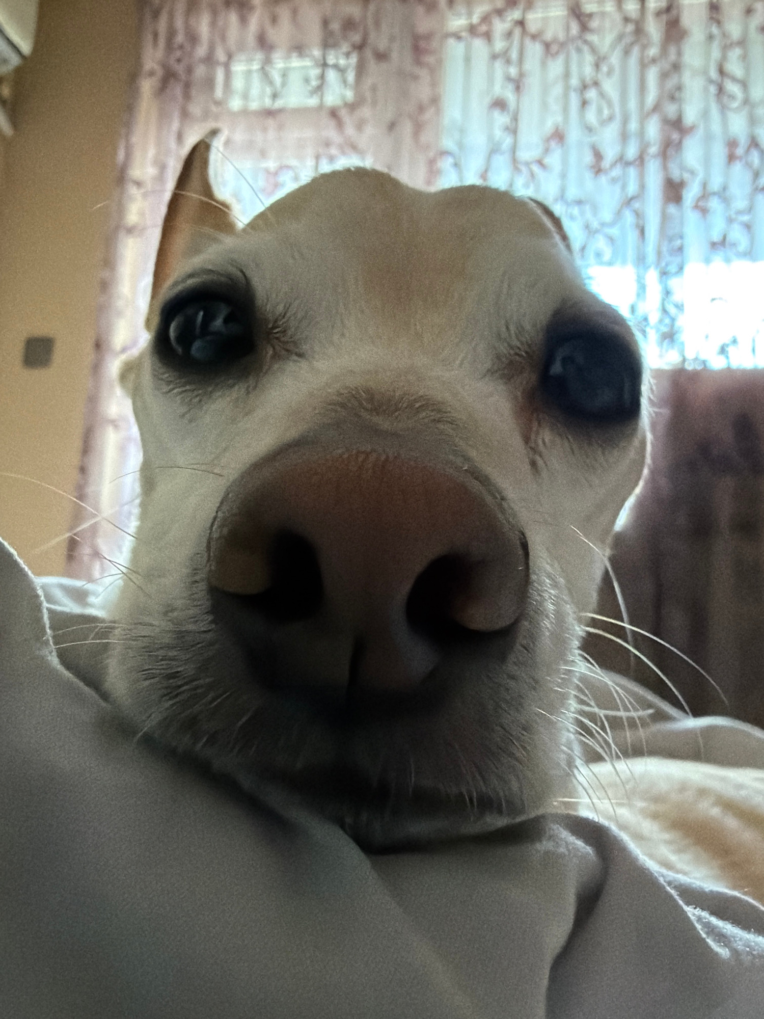 A light-colored dog, possibly a Labrador or similar breed, is captured in an extremely close-up, vertical portrait, making its face the dominant subject. The image is rotated 90 degrees clockwise, giv…read more