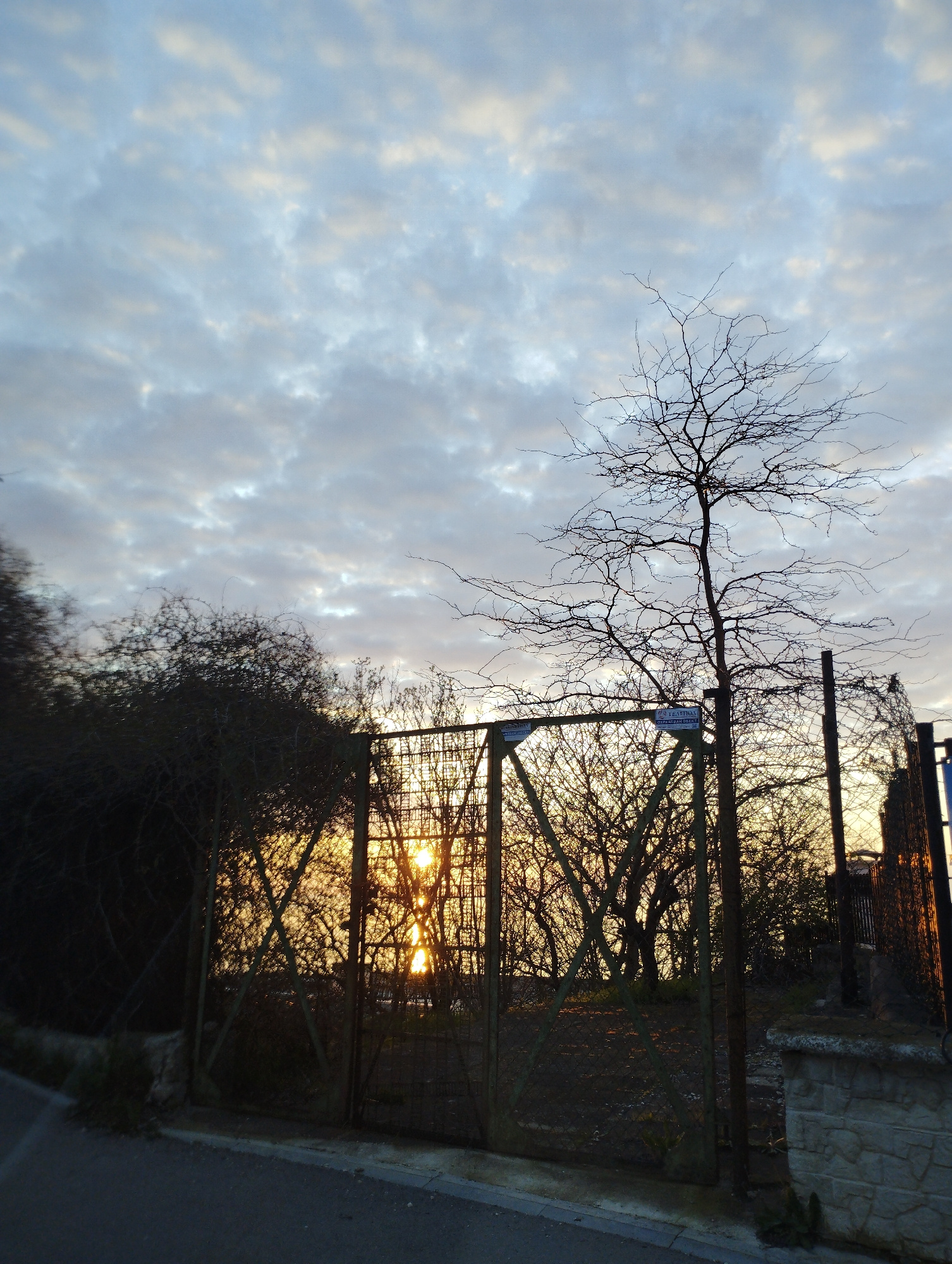 The image shows a metal gate in front of overgrown vegetation. Through the gate, trees are visible, and the sun appears to be setting or rising, creating a bright light behind the trees. A leafless tr…read more