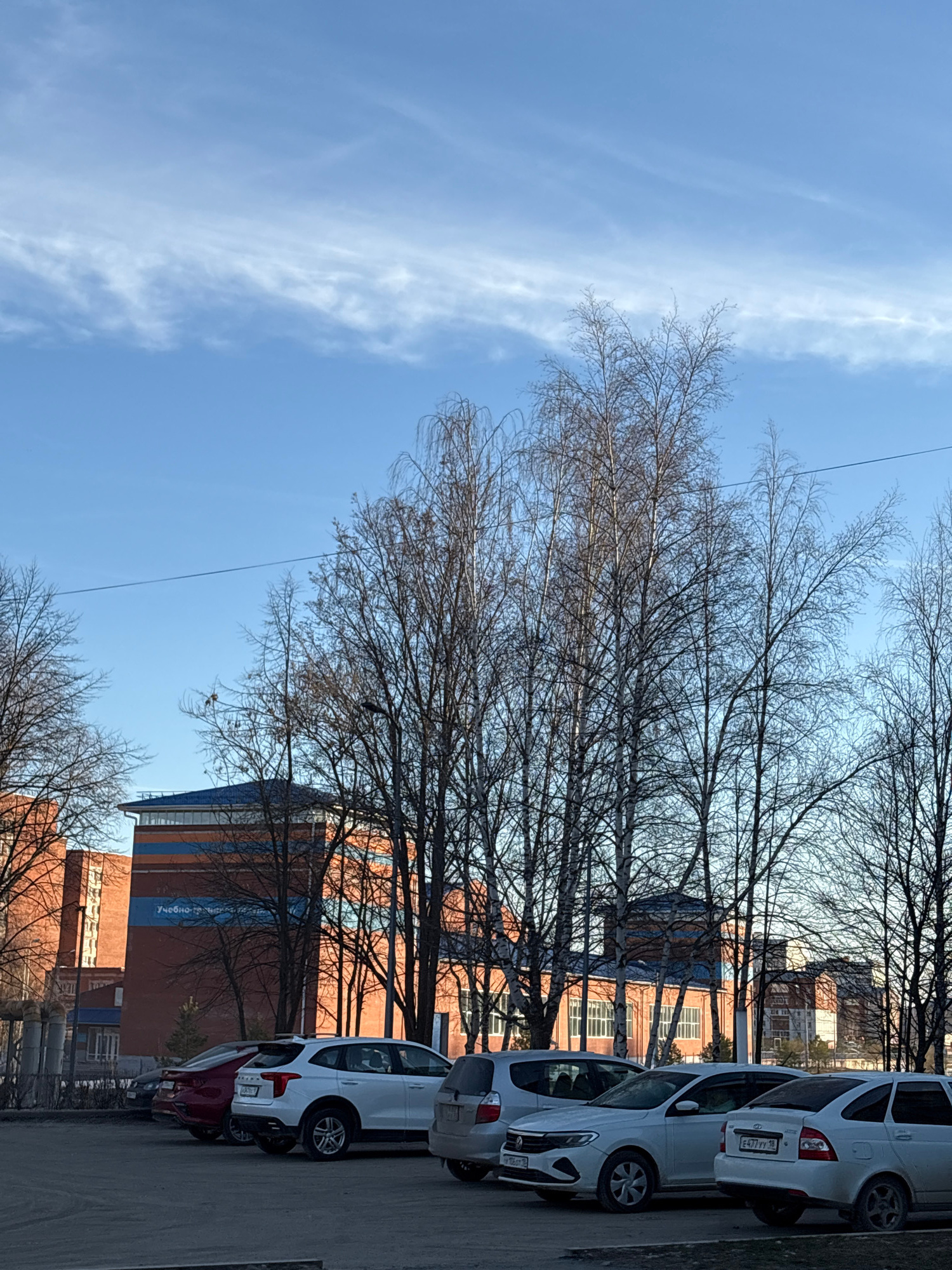 The image presents an outdoor scene in Votkinsk, Russia, captured on a clear, sunny day, likely in late autumn or early spring due to the bare branches of the trees. The sky is bright blue with delica…read more