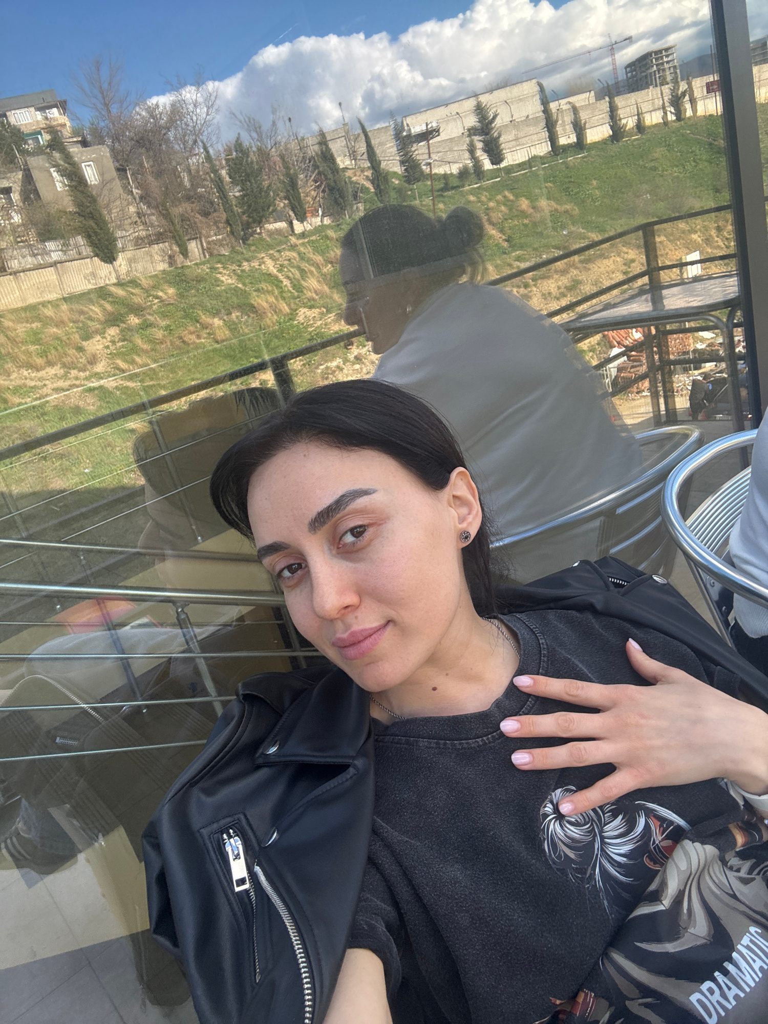 A woman with dark hair is seated at a table outdoors. She wears a dark-colored top with a design, a black jacket, and a necklace. Her left hand rests on her upper chest area. The table has a glass top…read more