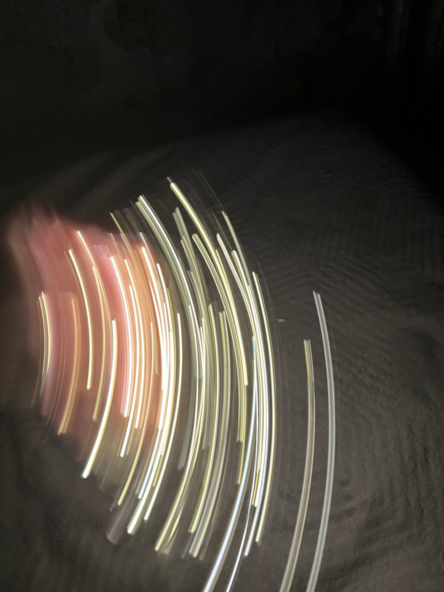 The image shows light streaks against a dark background. The curved streaks are light yellow and white, with a pinkish hue in the lower portion. The background is predominantly dark, with textural det…read more