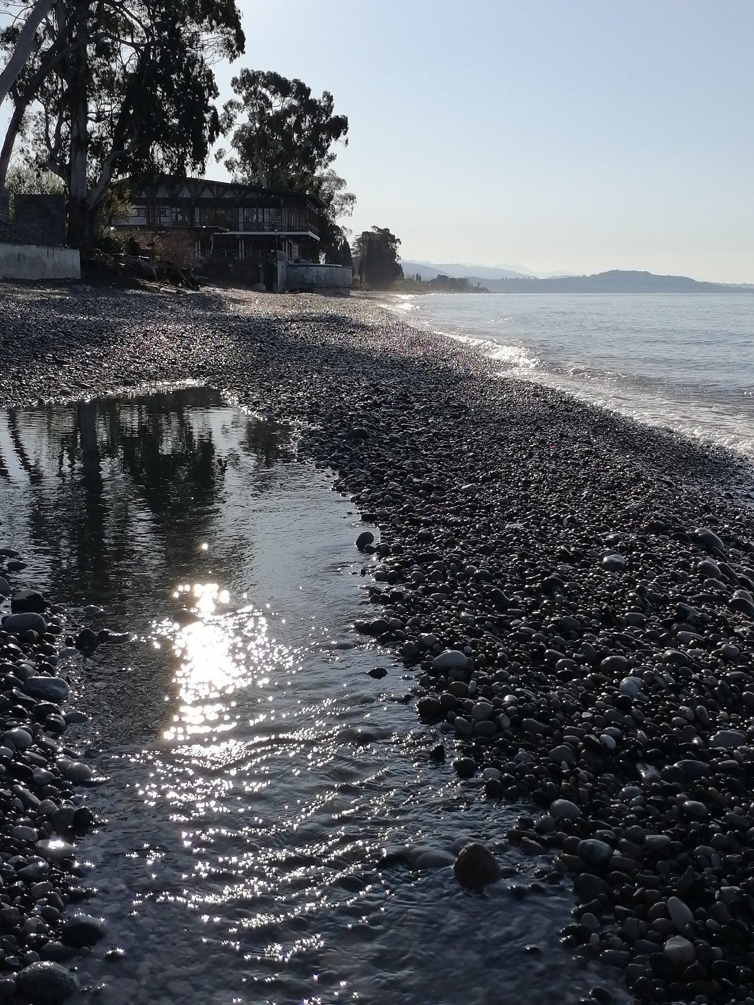 The image shows a pebble beach in New Athos, Abkhazia, with a small stream of water flowing across the pebbles towards the sea. The water reflects sunlight and the shadows of trees. In the background,…read more