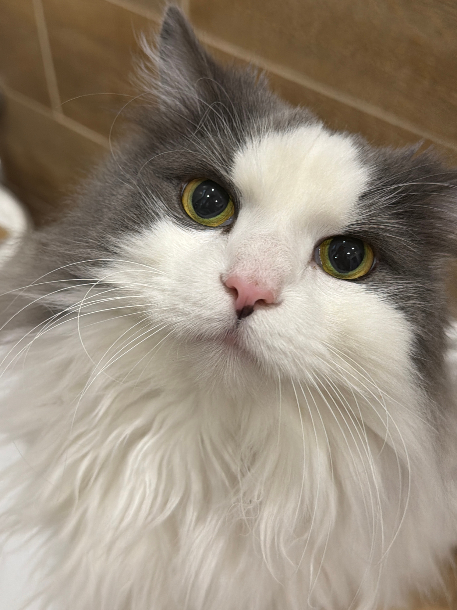 A close-up, slightly tilted, portrait of a cat. The cat has gray and white fur, yellow-green eyes, and a pink nose. The background is a neutral tan color. The cat is looking directly at the viewer. Thβ¦read more