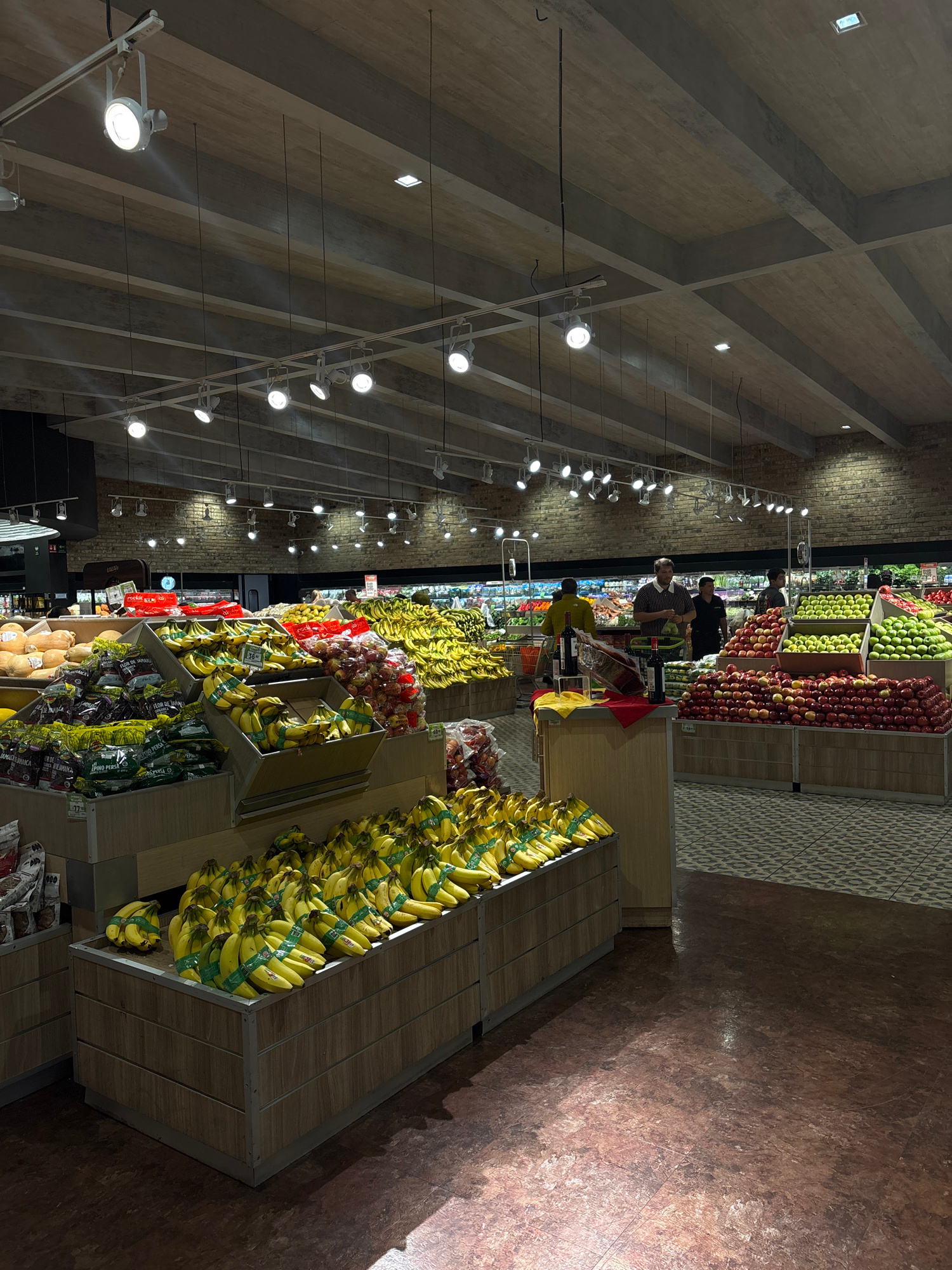 The image shows the interior of a grocery store in Heroica Puebla de Zaragoza, Mexico. Rows of produce are displayed on wooden shelving units. Bananas are prominently featured in the foreground. In th…read more