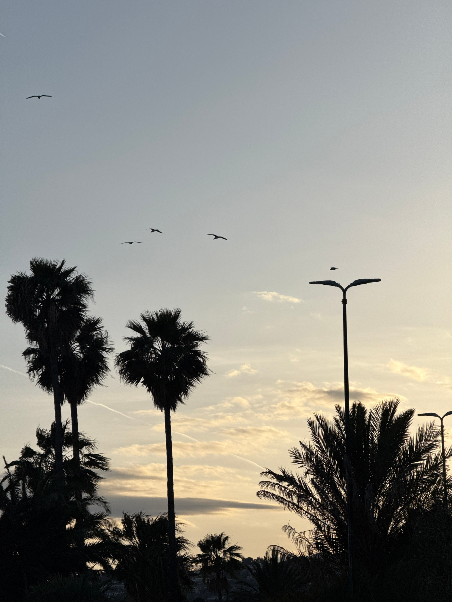 The image depicts a landscape in Sanremo, Italy, featuring silhouette palm trees against a sky at dusk or dawn. Three palm trees are visible in the foreground, with their trunks and fronds appearing i…read more