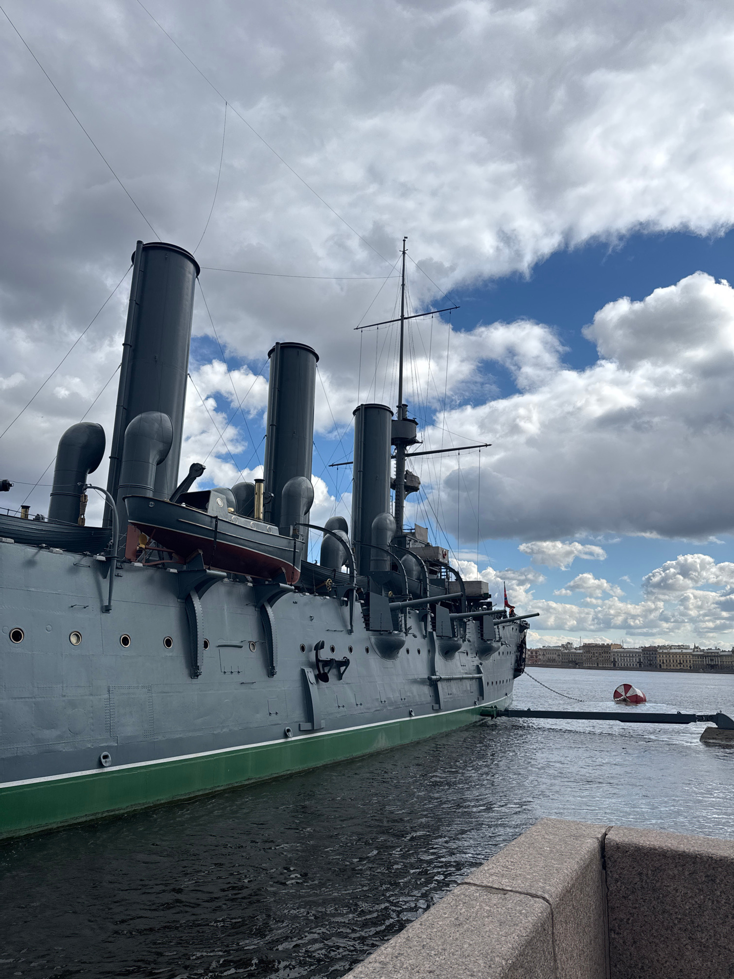 The image shows the Cruiser Aurora, a Russian protected cruiser, permanently docked in Saint Petersburg, Russia. The vessel is painted in a gray color scheme with a green and white stripe at the waterβ¦read more