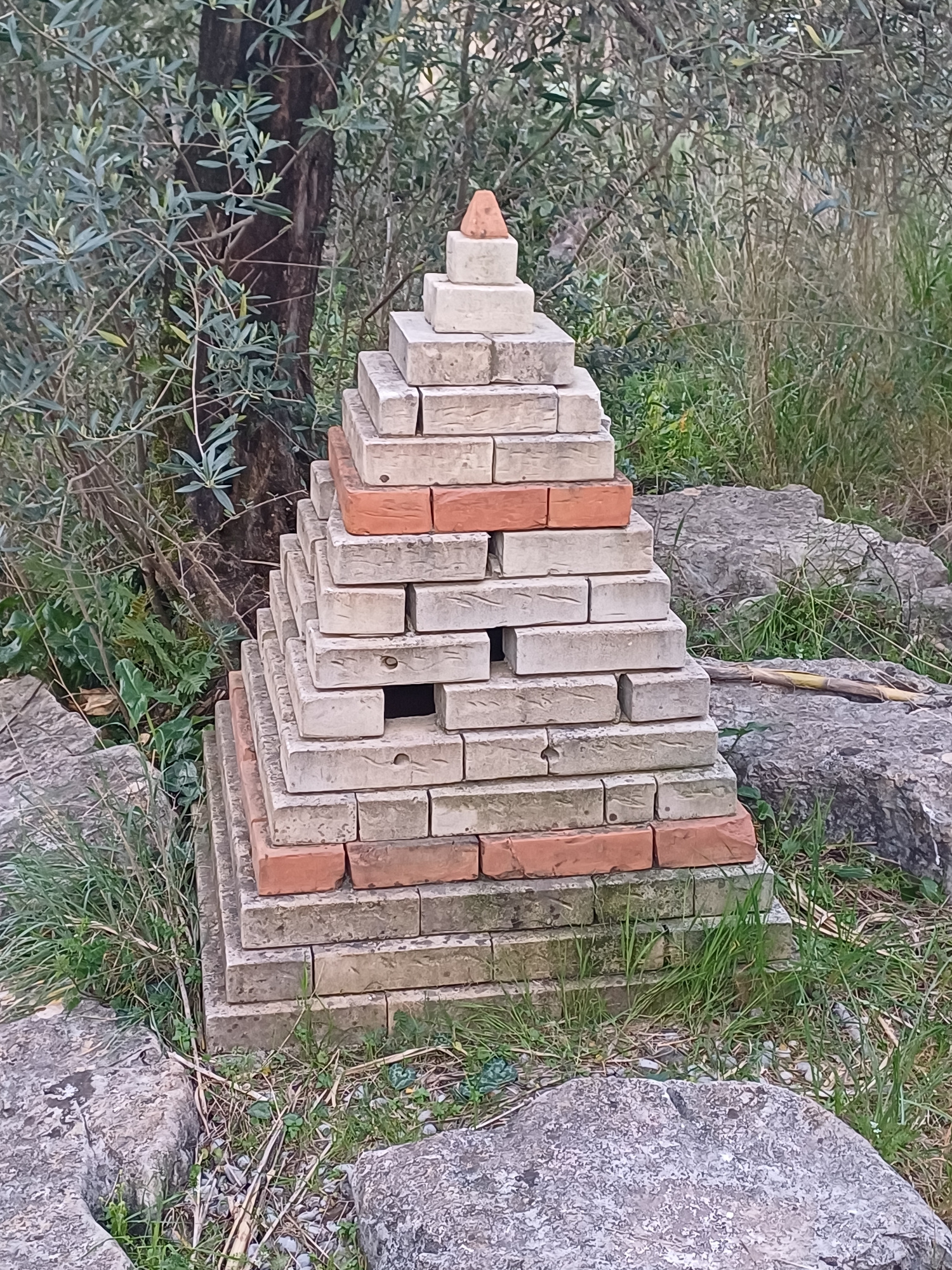 A landscape photo taken in Radovići, Montenegro, shows a roughly triangular stack of rectangular bricks, with alternating layers of gray and orange bricks, placed among rocks, grass, and leafy plants.…read more