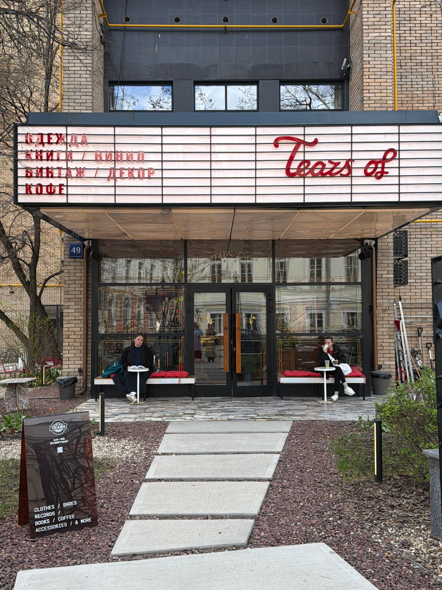 This image captures the facade of a shop or cafe in Moscow, Russia, featuring an entrance with outdoor seating under an overcast daytime sky. The building displays a mix of architectural styles, with…read more