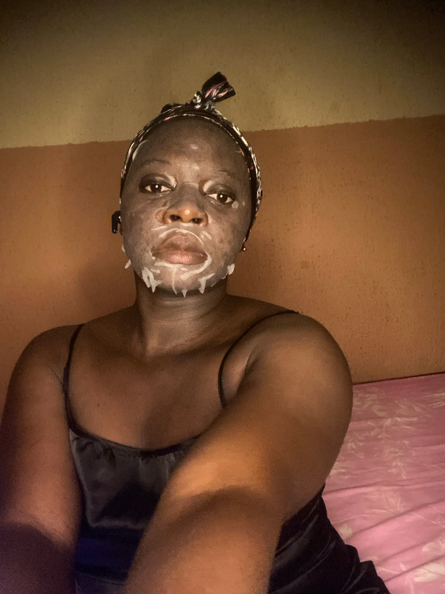 An indoor, medium shot captures a person of color, possibly female, lying down and looking towards the camera, suggesting a selfie or self-portrait. The subject has dark skin and is wearing a dark, poβ¦read more