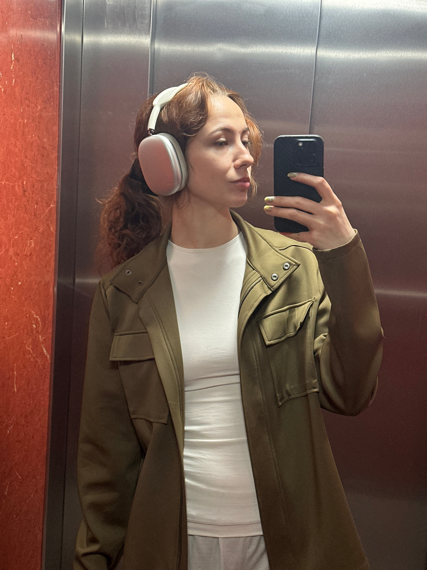 A woman takes a selfie in an elevator. She wears white headphones, a white t-shirt, and a green jacket. She holds a black smartphone in her right hand. The elevator has a brushed metal wall and a red…read more